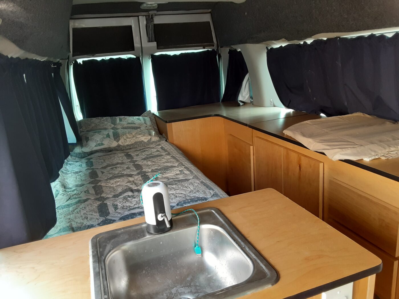 This is not a fixer upper as i have done a lot of work on it. At 52000 miles it runs very well.19.5 feet long with custom cabinets ,bedding, electrical for 12v and AC, two batteries ( one in engine other inside van with isolator for engine), tinted windows , new tires., USB charged water pump with sink, new flooring, Portable fridge/freezer cooler which runs on 12v or AC.. There is room to make more improvements as desired.