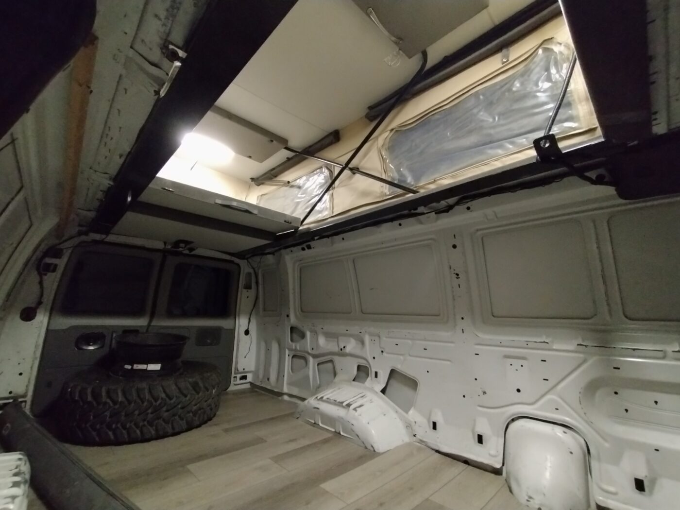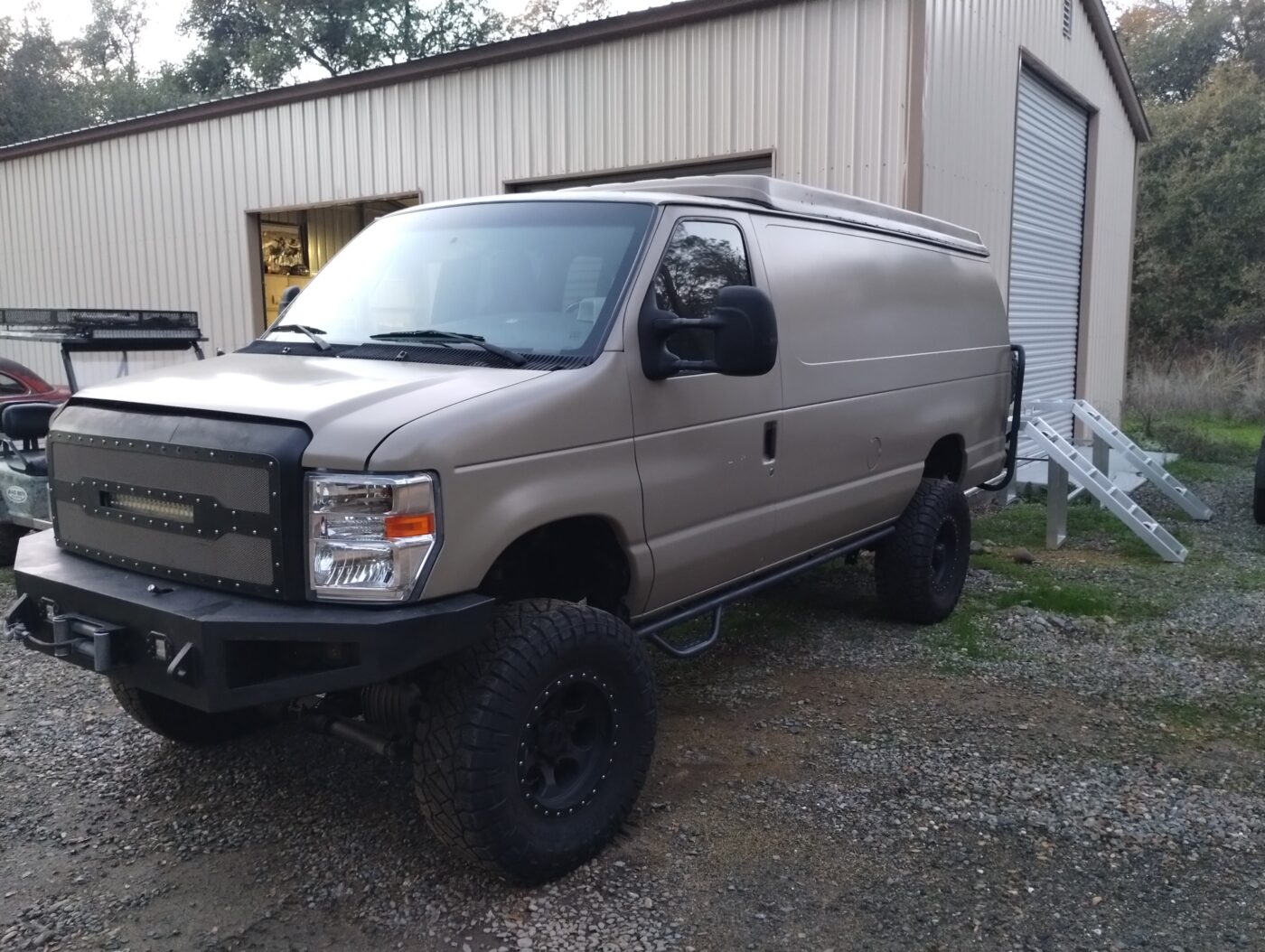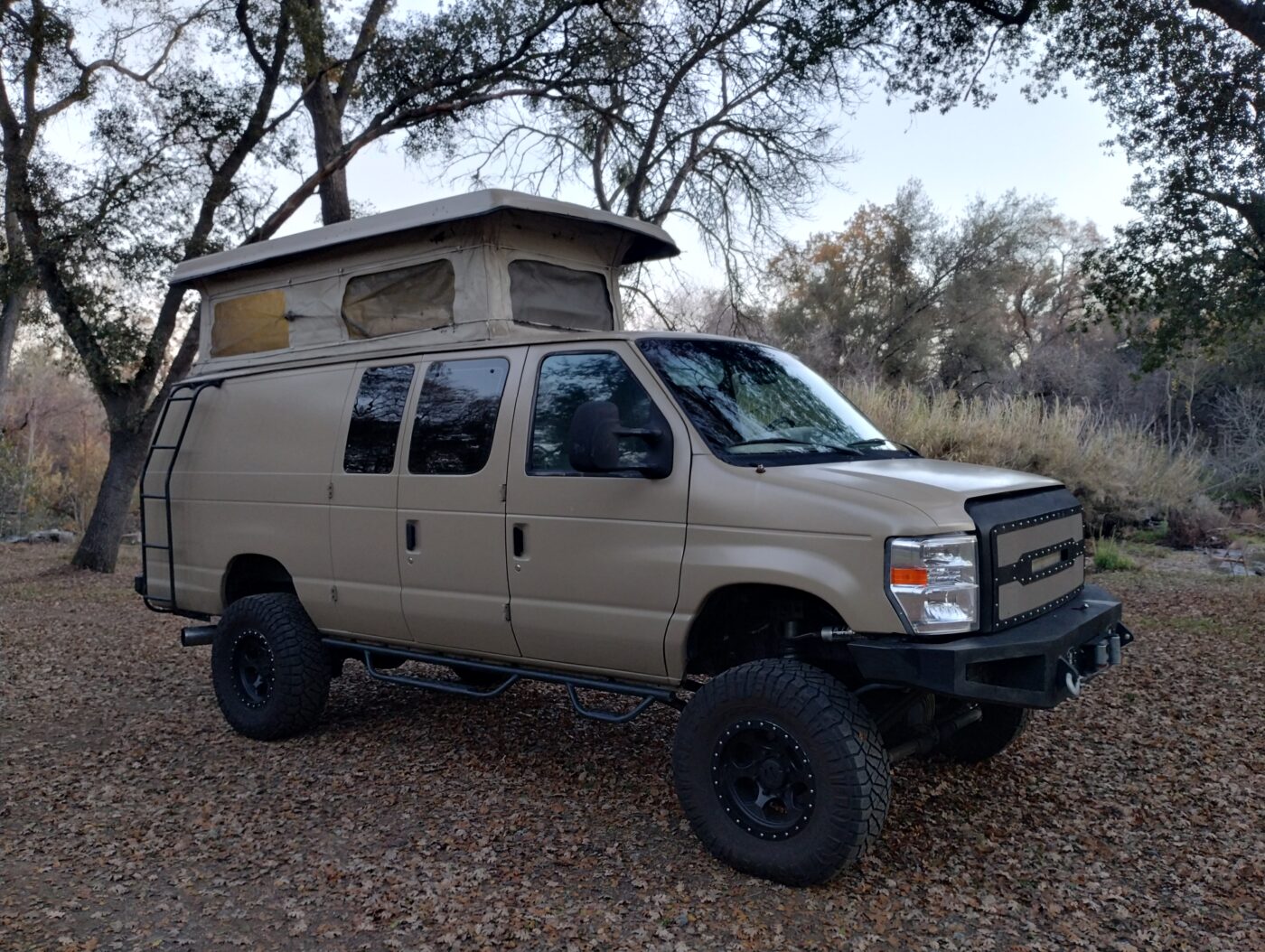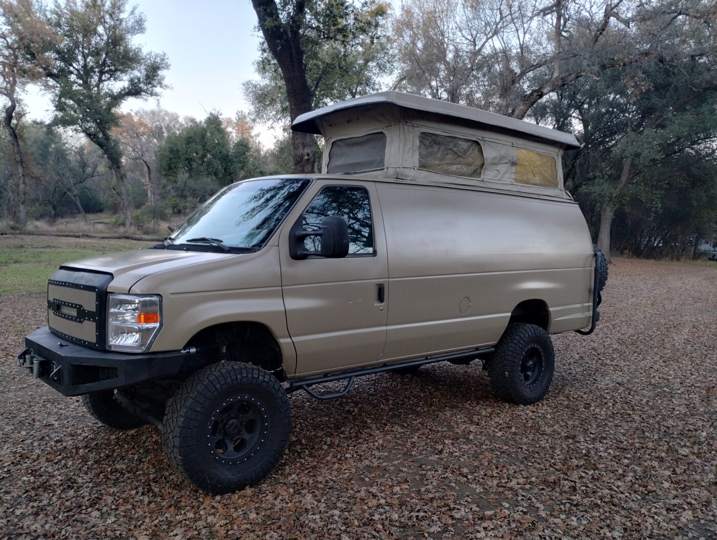 2008 ford e350 extended body, 144,000 miles, f350 axles with king coilovers on the front (bought van already built, so I don’t know who did the conversions), has sports Mobile pop top, 6.0 power stroke diesel and had bulletproof done at 130k miles with receipts. winch and front and rear bumpers, tire carrier, 35″ tires, passenger seat spins around, laminate flooring, touch screen stereo, lights in the pop top, interior ready for your build out! Drives very smooth and straight, freeway speeds are not a problem. Clean California title. No rust.