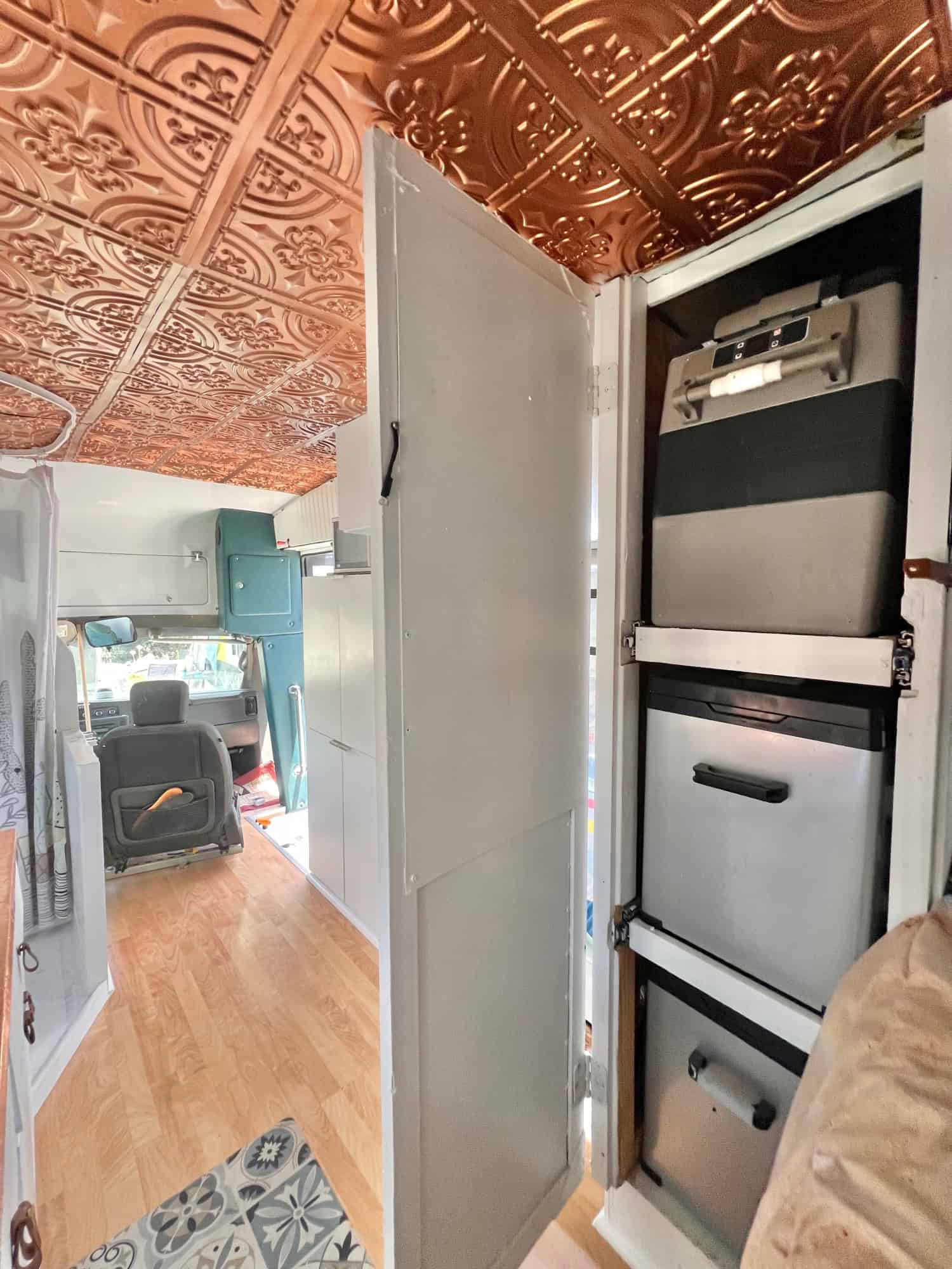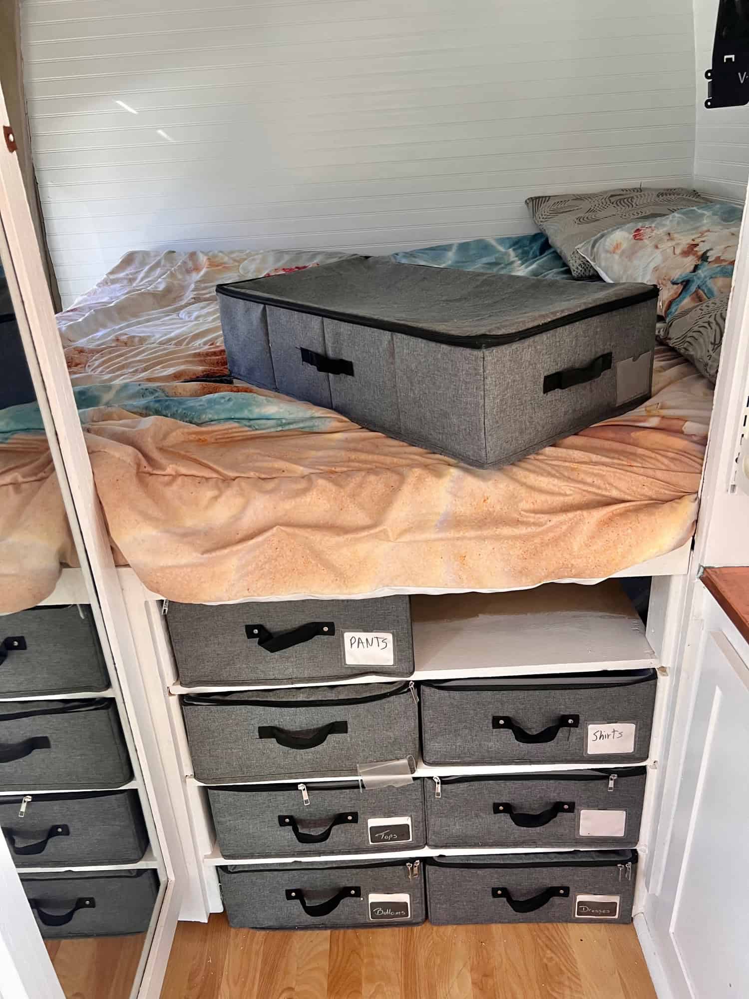 Ample storage including the pantry, overhead cabinets, kitchen cabinets, clothes bins, over-cab, and under the bed storage.