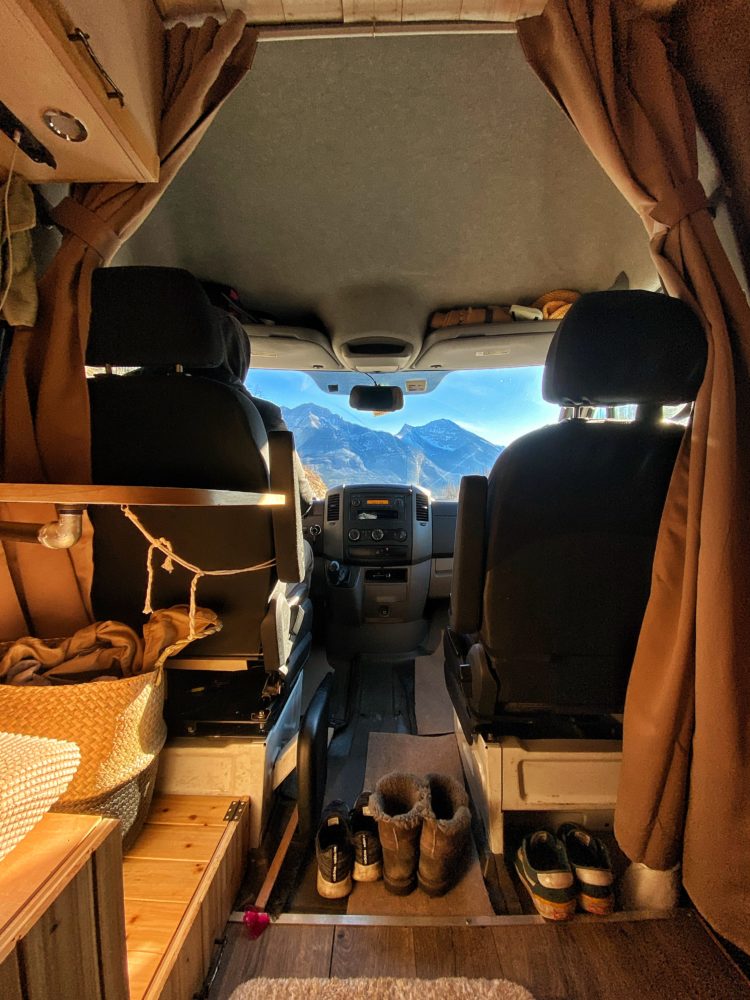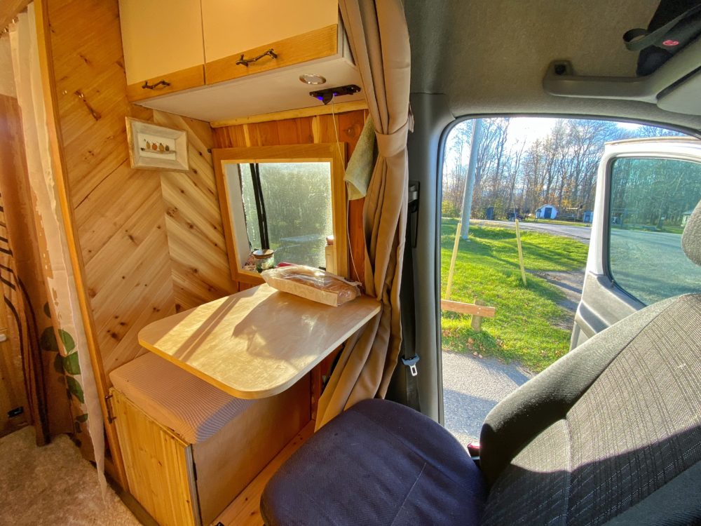 • Storage: We’ve got so much storage in the van. 2 cabinets up top above the dinette, 3 cabinets above bed, next to the bed (above the electrical unit), kitchen cabinets, under dining seat, above driver’s and passenger’s seats, and also under the bed.