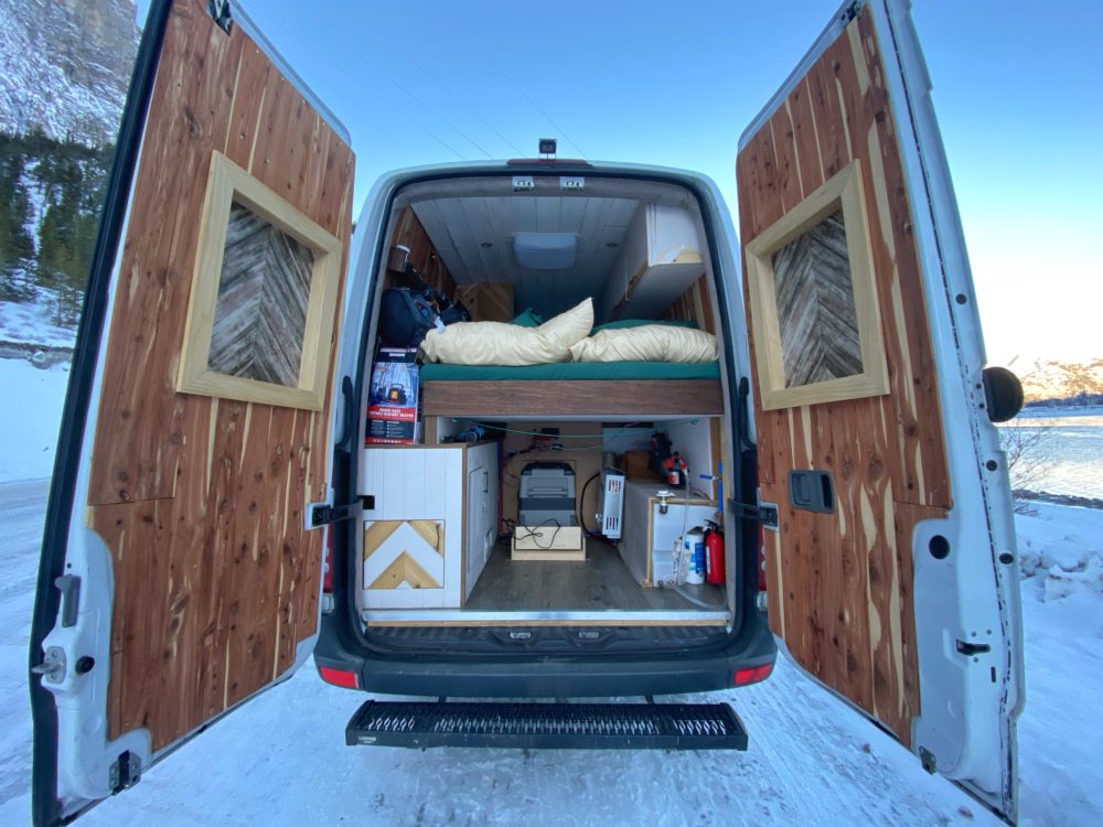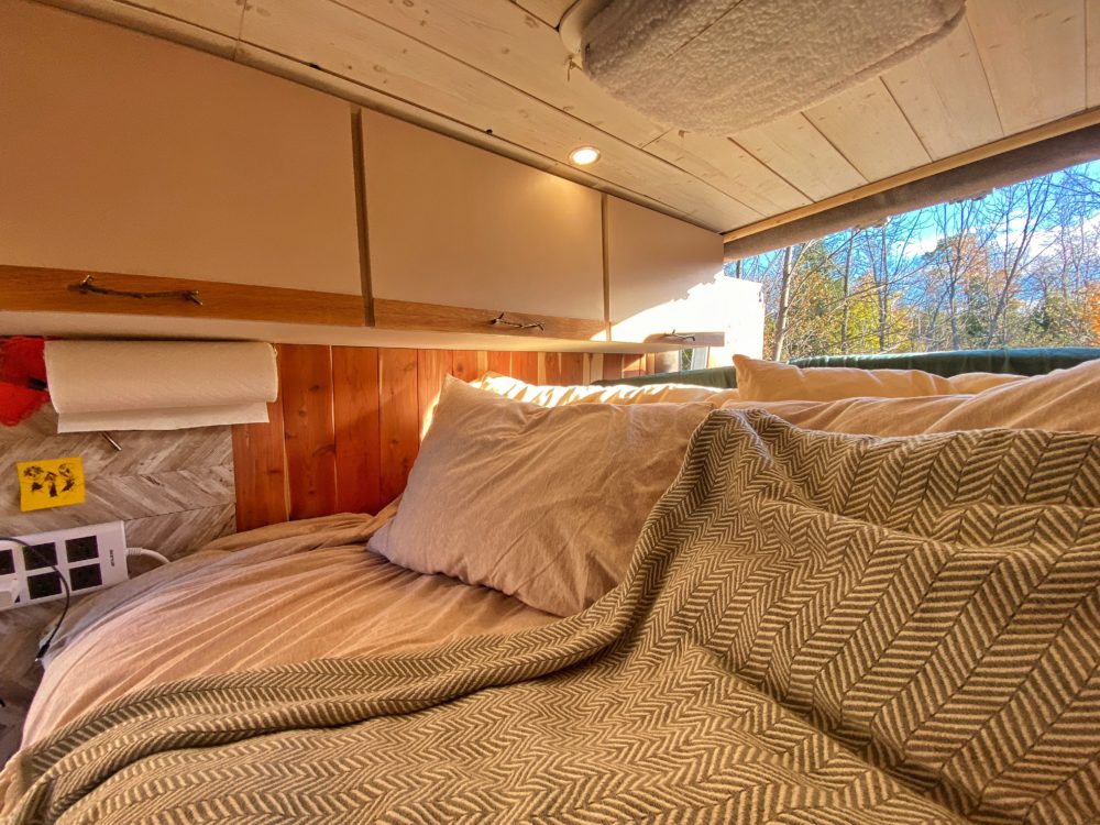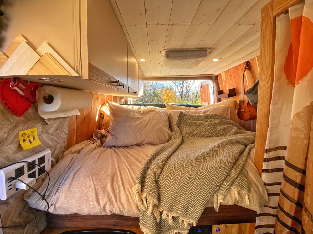• The bed is a full-sized bed that is slightly tailored to fit the shape of the van and to accommodate the shower. There is a little corner cut out but two people can still sleep very comfortably!