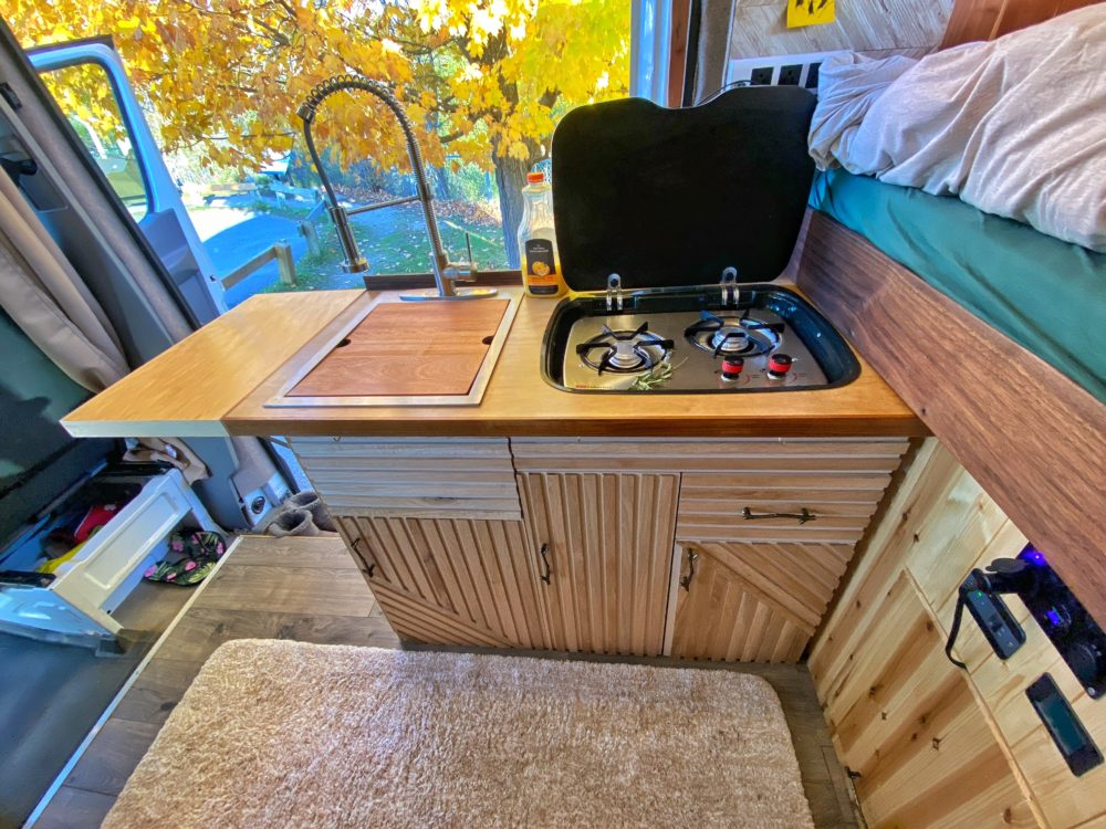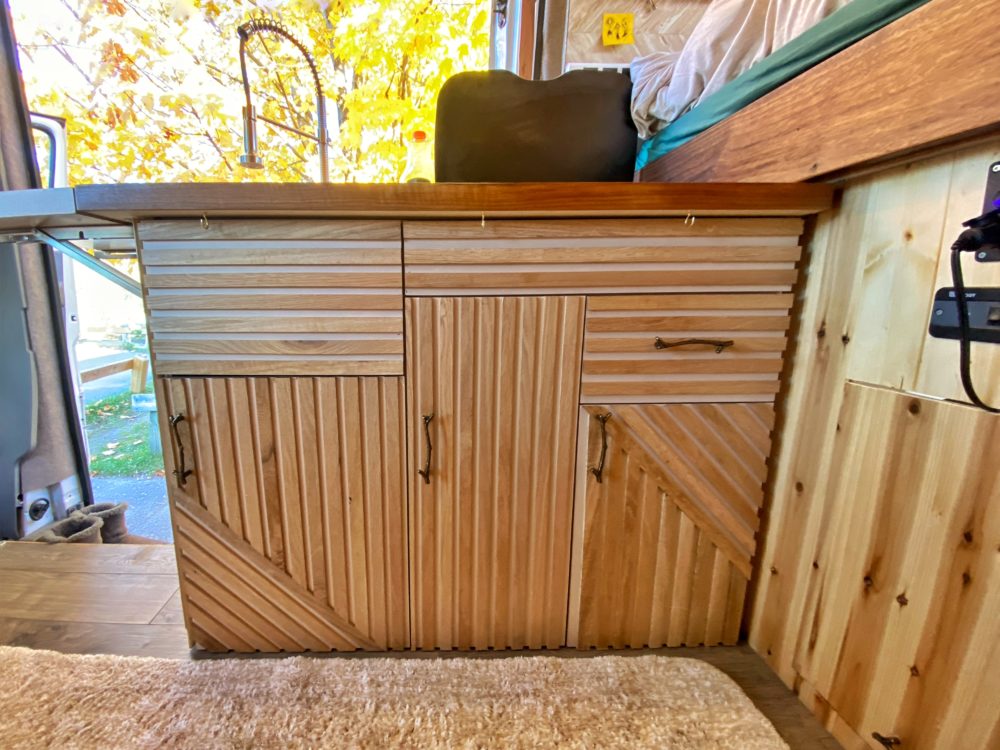 • I wanted the van to look and feel like a cabin, so there are a lot of beautiful pieces of wood used to make this happen. There are pieces of real walnut, oak, and poplar used to accent the kitchen, bed, window frames, and shower. These are not cheap pieces of wood, and they have all been treated to last in the van.