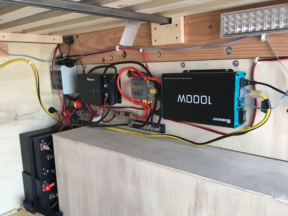 It features a full solar electric system, 400 watts of solar panels, 200 amp-hour lithium batteries, and a charge controller from Renogy that can receive power from the van’s alternator while also making sure your main van battery never goes flat and leaves you stranded.