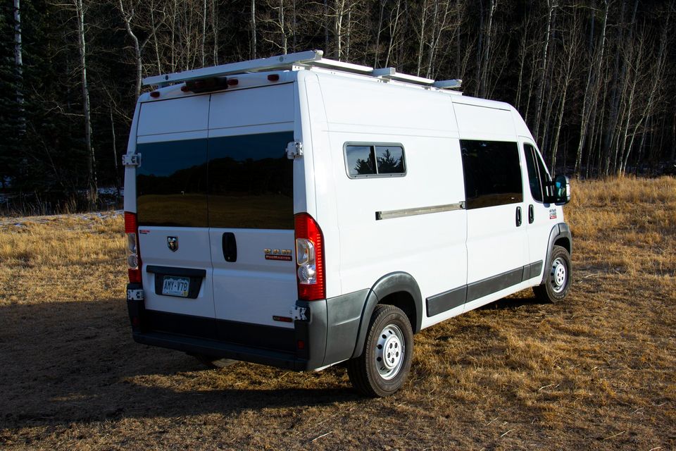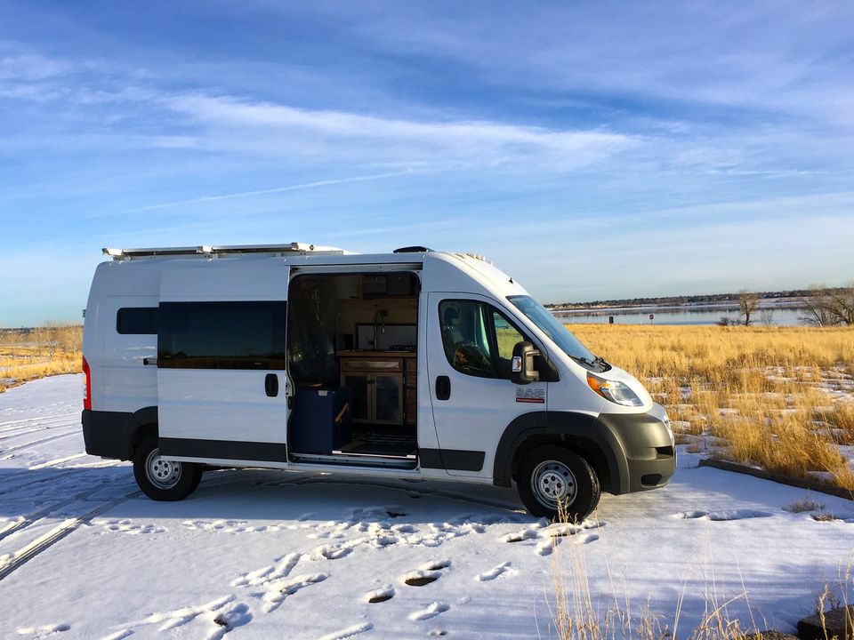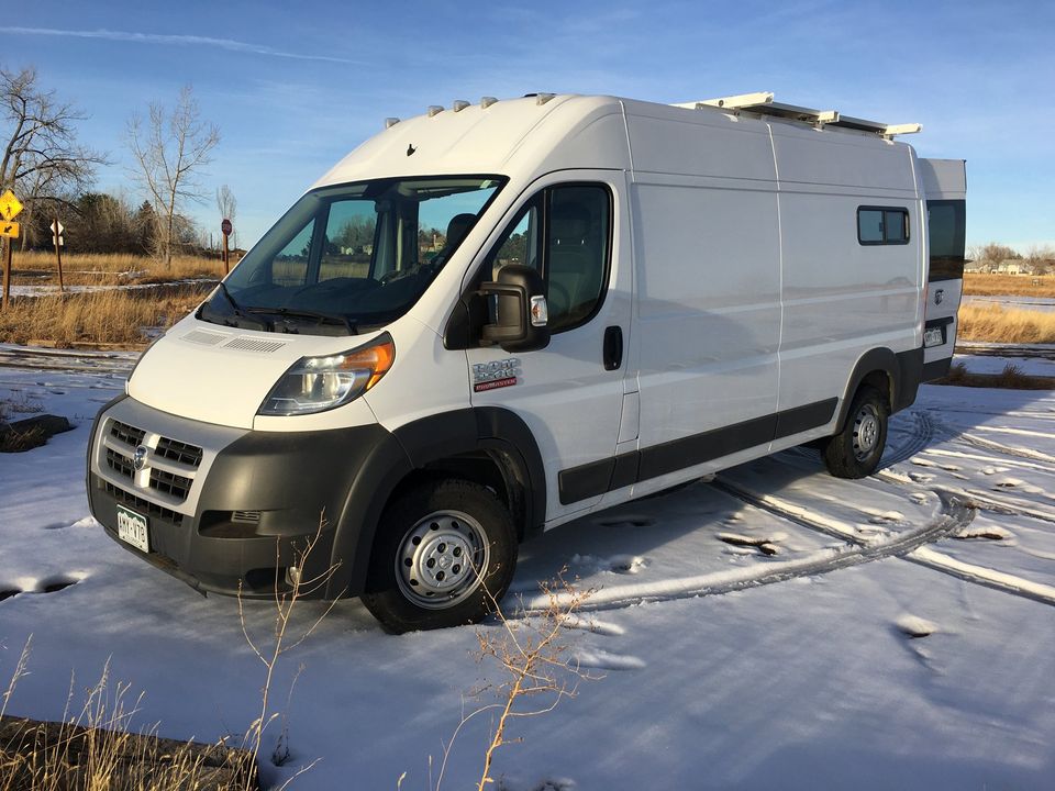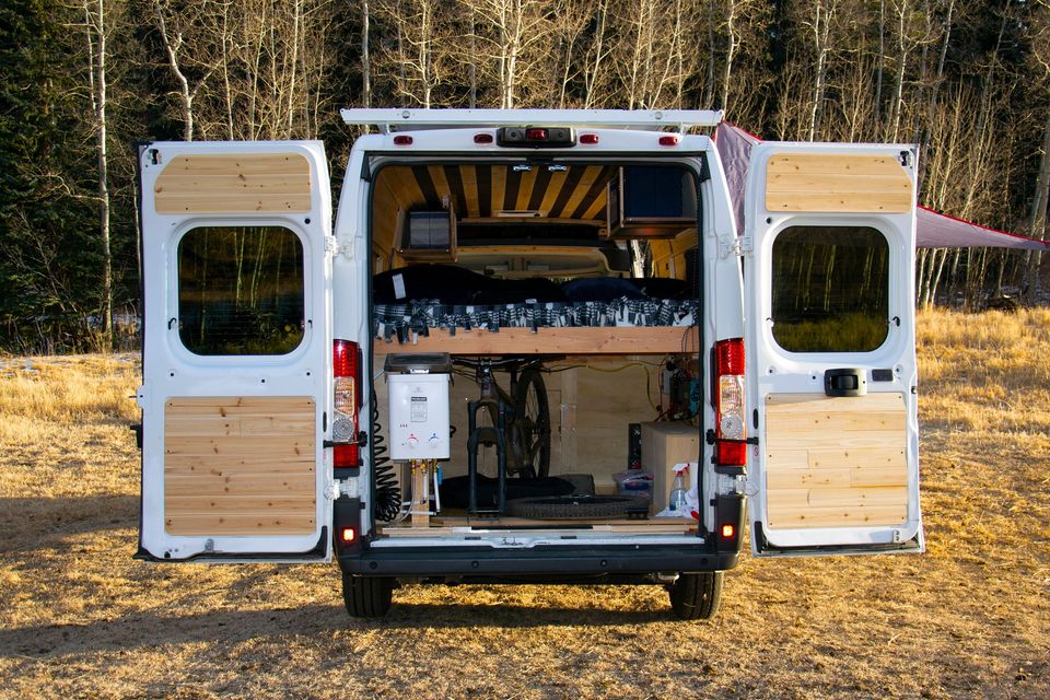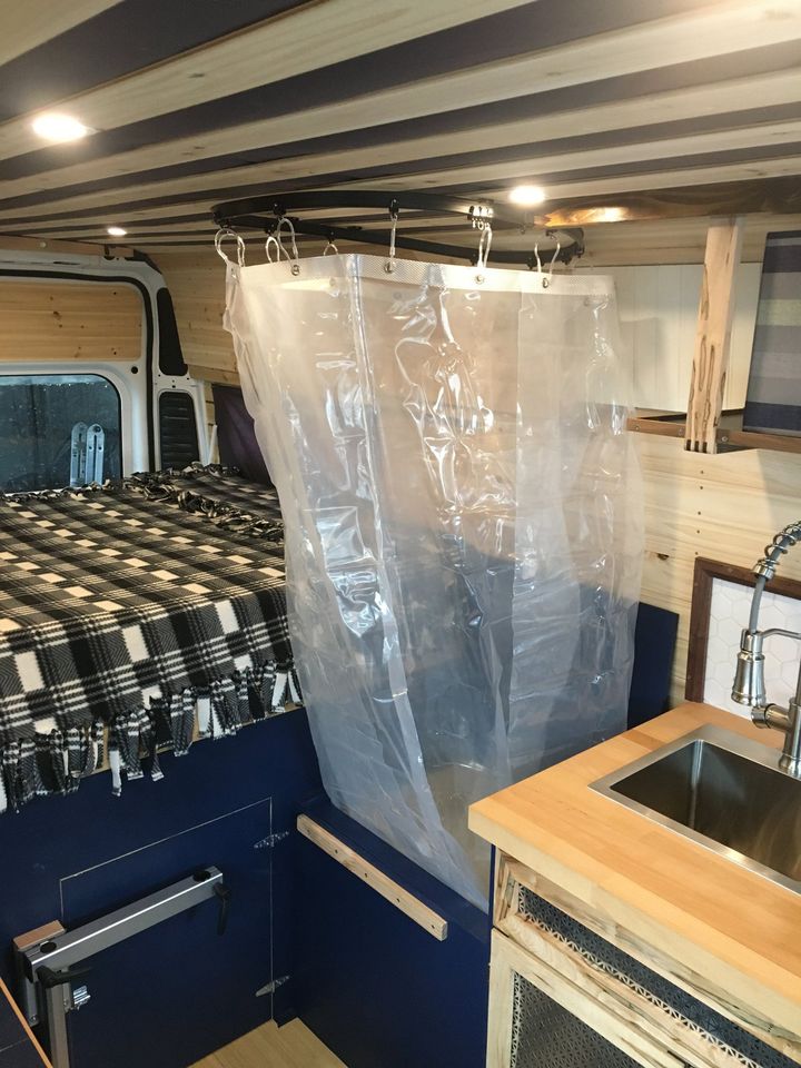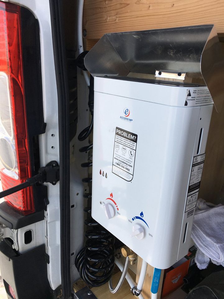 Renogy 1000w Pure Sine Wave Inverter (with remote switch) Renogy BT Bluetooth Module (monitor solar setup via smartphone app) 4x 100w Solar Panels mounted on custom roof rack. 2x 100amp SOK LiFePO4 Batteries Battery Monitor. DC Loads and appliances: 8x LED Ceiling Puck Lights (dimmable) with 2x SPDT switches, one by the sliding entrance door and one by the bed. Maxxfan 4500k with remote. Alpicool T-60 Chest fridge/freezer 5KW Diesel Heater tapped into the main Promaster fuel tank with remote. 2x USB A & C charging outlets with battery voltage display. Seaflo Diaphragm Water Pump 33 Series with 2 SPDT switches, one next to faucet and another accessible from the rear shower/bike wash. AC loads: 2 burner gas cooktop with electronic ignition. Pop-up power bank with 3 pin electrical and USB outlets, also includes wireless phone charging. Removable LED lighting strip for garage (battery-powered, charged by inverter) Water System: 21 gallon freshwater tank Pex Connections throughout. 2x 5 gallon gray water tanks Seaflo Pressurized Accumulator Tank Stainless Steel sink and Faucet. EccoTemp L5 Tankless Hot Water Heater. (Sends hot water to kitchen sink, inside shower and external shower/bike wash) Hidden inside shower pan. External shower hose/bike wash.