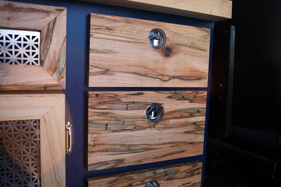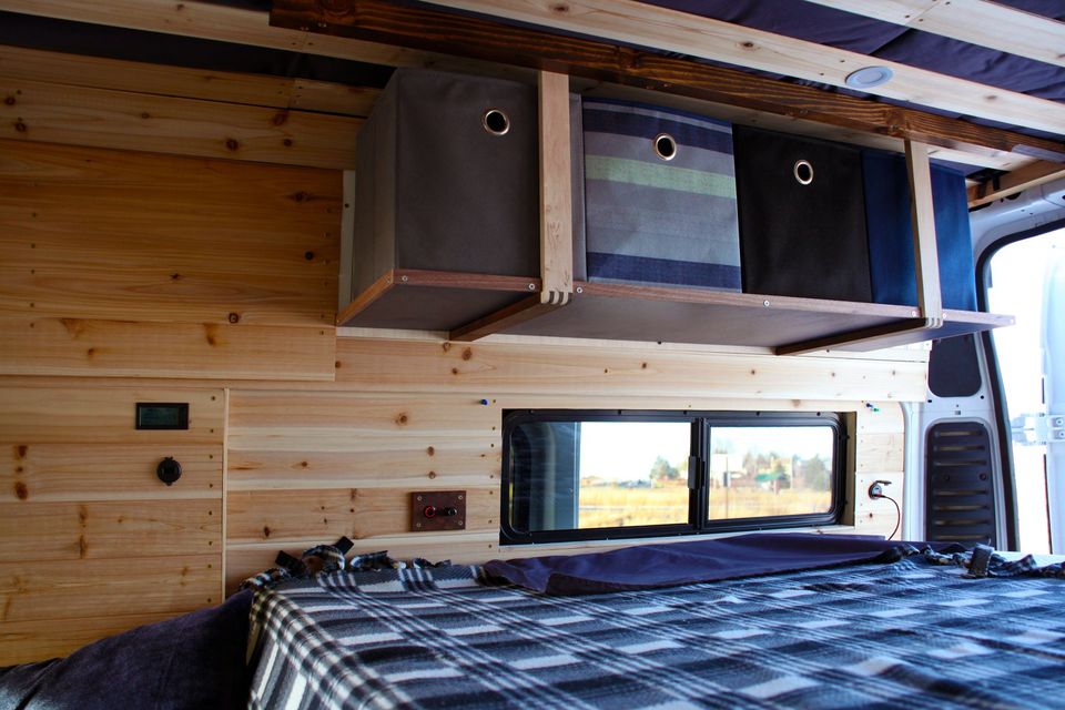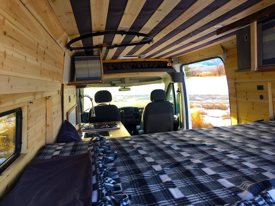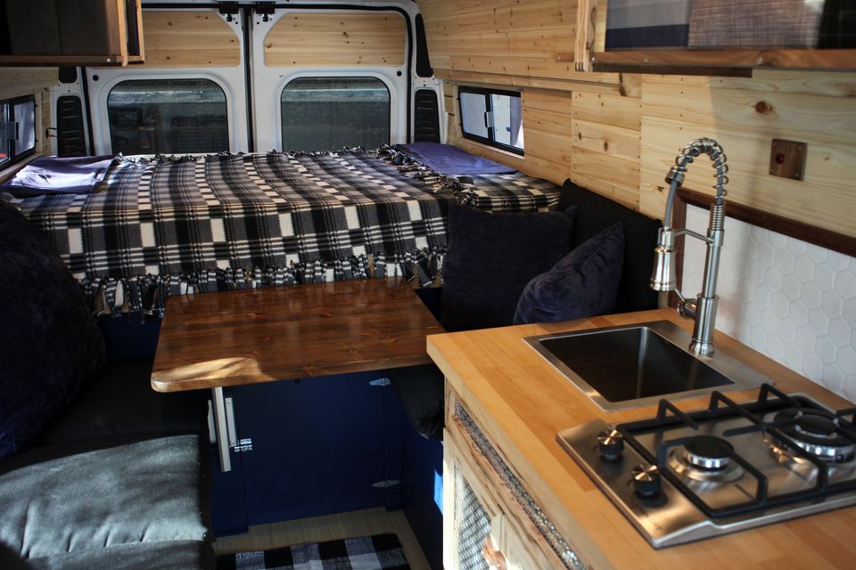 Solid glass window in sliding side door. Known issues: Small crack in rear fender plastic, small dings in bodywork. Interior: Large garage storage area under bed, big enough for all your gear even bikes. Kilmat sound and vibration deadening. Havelock natural wool insulation in floor, ceiling, and walls. Lightweight Cedar paneling Beech Butcher block kitchen countertop Solid Ambrosia Maple cabinet doors and drawer fronts. Walnut accents and details throughout the build. (Handles, switch panels, axe brackets) Adjustable and removable dining table top (this also provides the 3rd sleeping area) Solid Bamboo Flooring Foldaway kitchen shelf. Camping Axe with custom-made leather and walnut holder. Blackout curtains for side, rear doors and to front cabin. New memory foam mattress Co2 detector