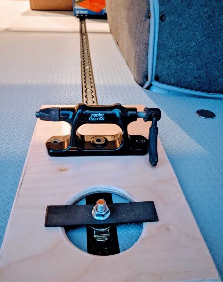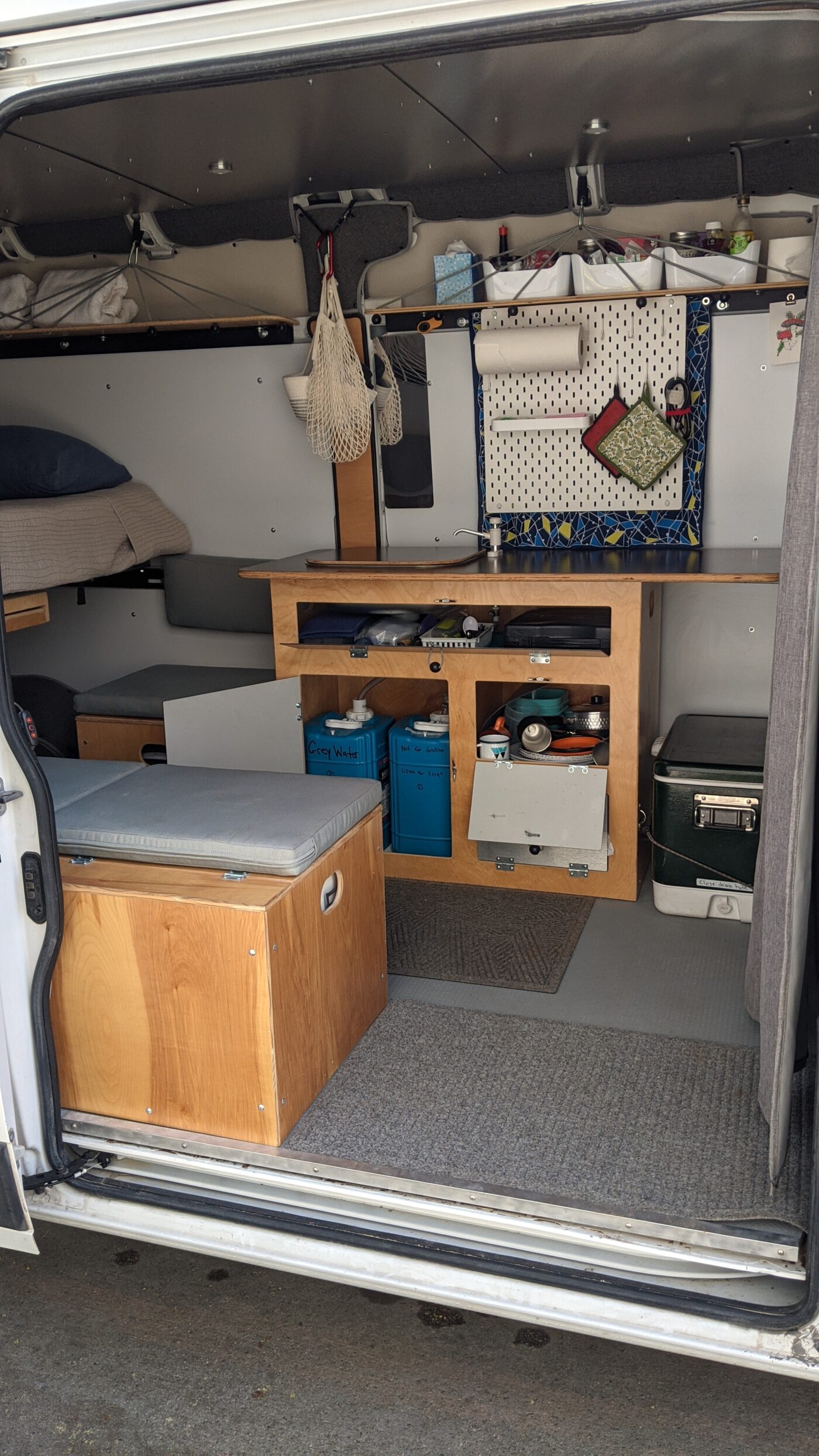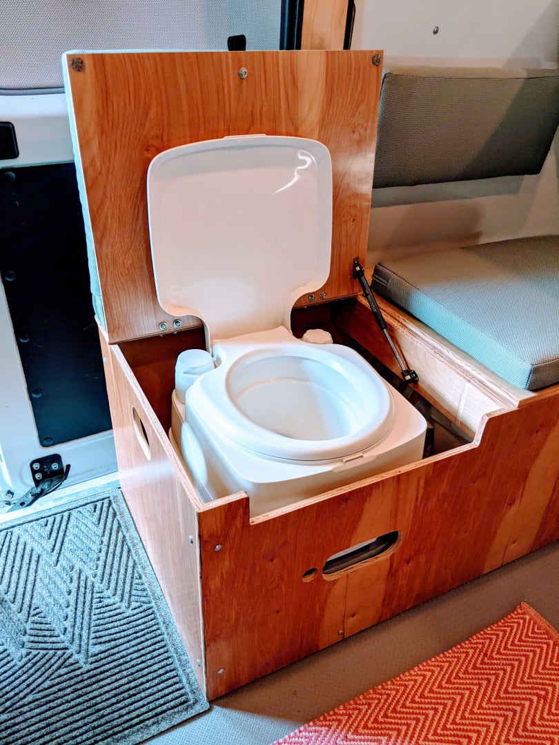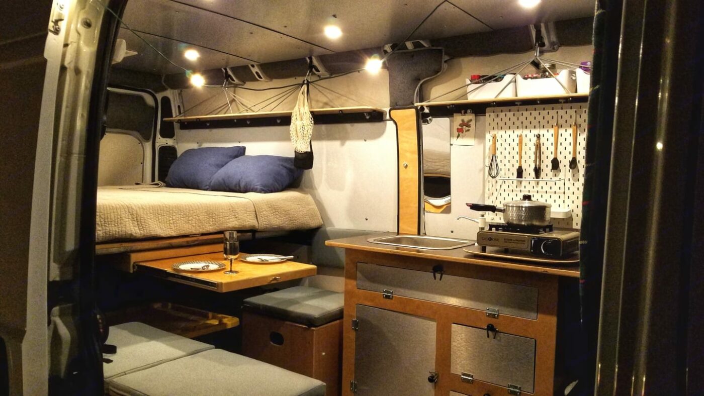 Outfitted with a kitchen galley and a hand pump sink (room temperature water), a 5 gallon freshwater, and 5 gallon greywater tank. Also included is a single burner GasOne stove (runs on butane or propane). There are three storage boxes, one of which houses the cassette toilet. The ceiling puck lights are powered by a small Goal Zero Yeti battery, which can also charge small devices and charges through a 12V plug while driving.