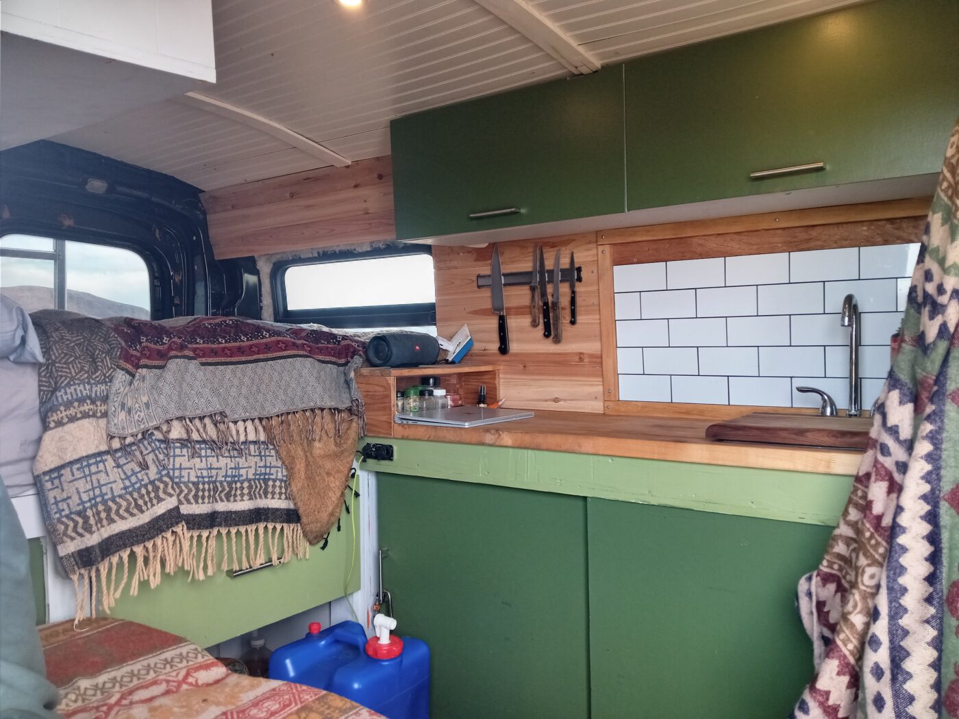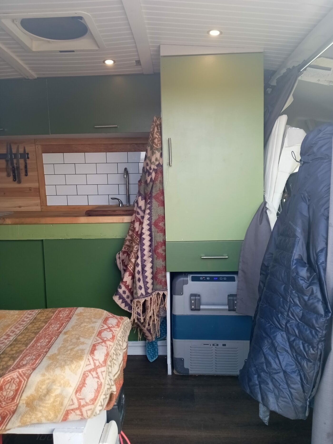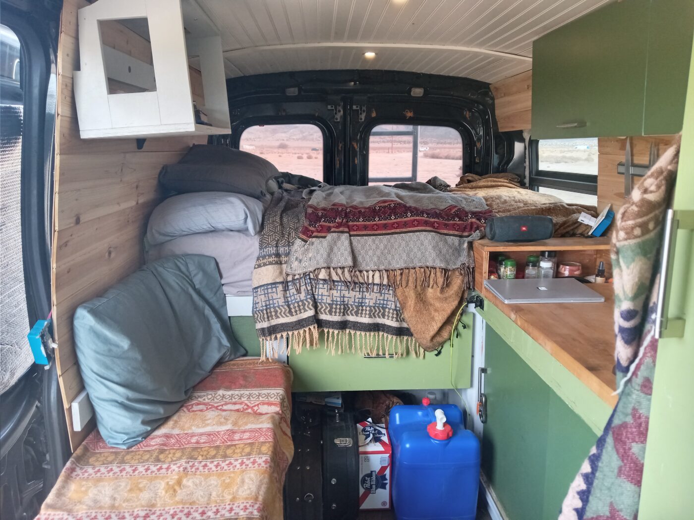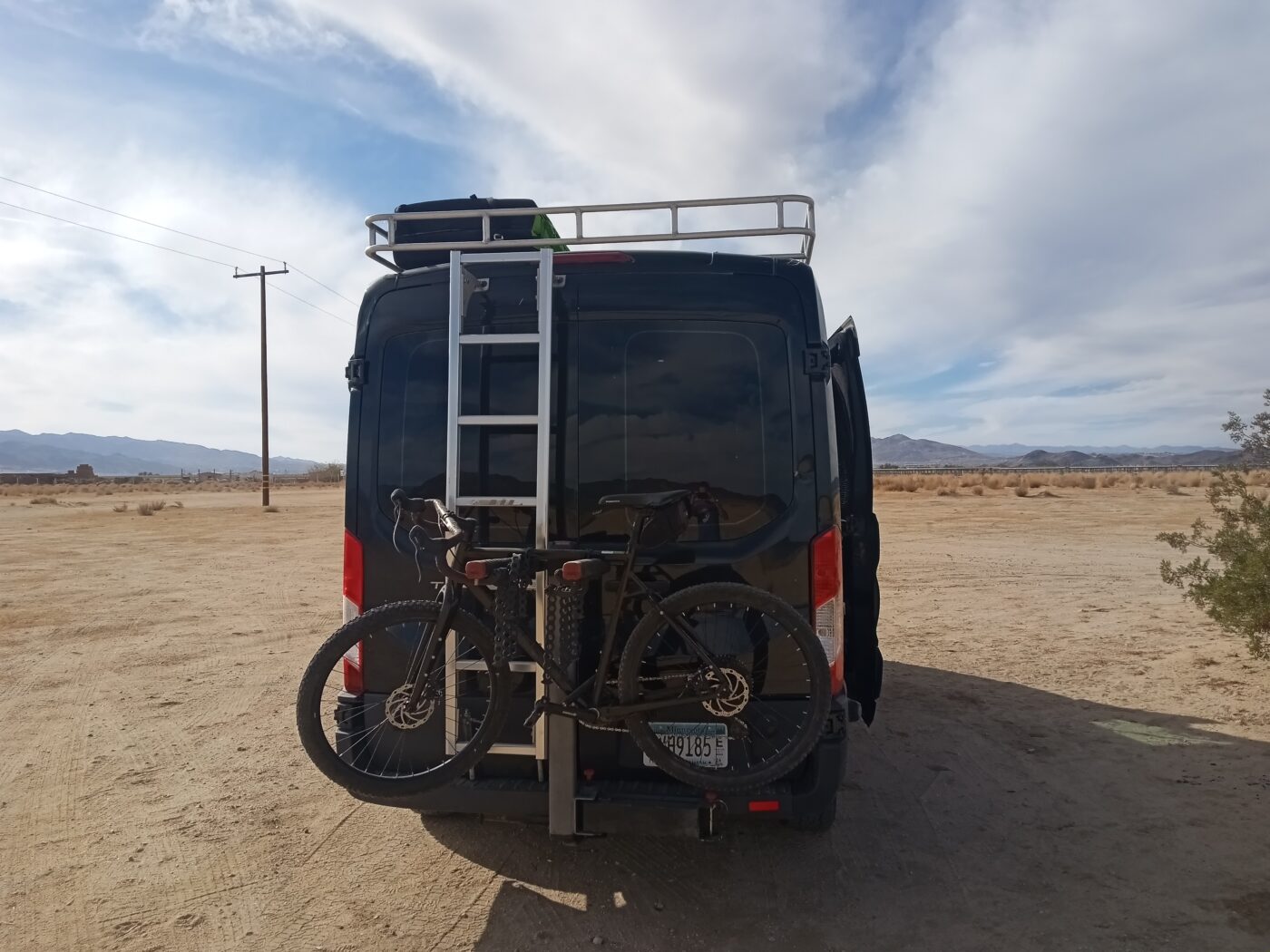 Van has 300w of solar up top, 100ah lithium iron battery, 1000w pure sine wave inverter, 20amp dc-dc charger. Maxxfan with rain protection. Dometic fridge. Coleman 2 burner stove that runs to a 20lb propane tank. Custom aluminum rack up top with aluminum ladder.