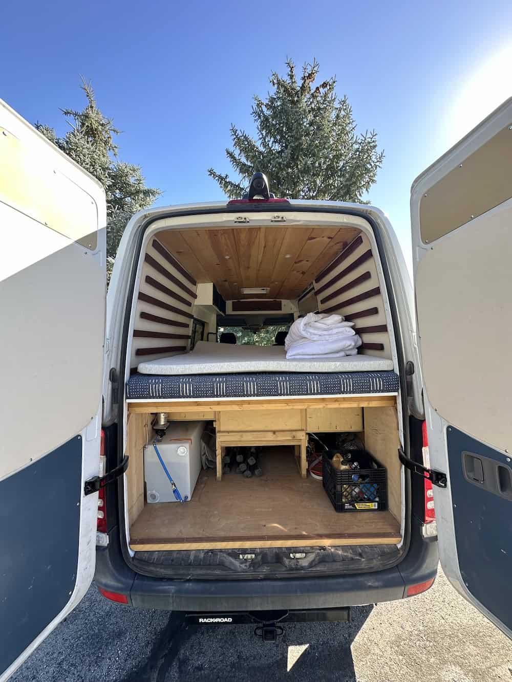 We are selling our beautiful and comfortable, hand-built 2017 Sprinter van with a 144" wheel base. The van is fully outfitted with rooftop solar/electric (Victron inverter system), power outlets & USB ports, overhead lights, 20 gallon freshwater tank with filter system, a Dometic fridge and stove, as well as a dinner table that seats 6 that is easily converted into a comfortable and spacious queen size bed.
