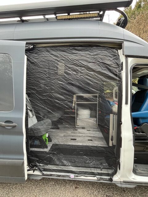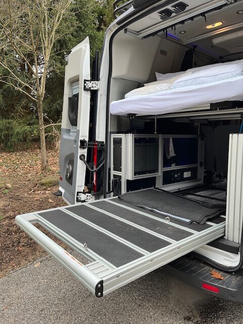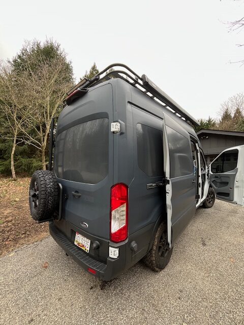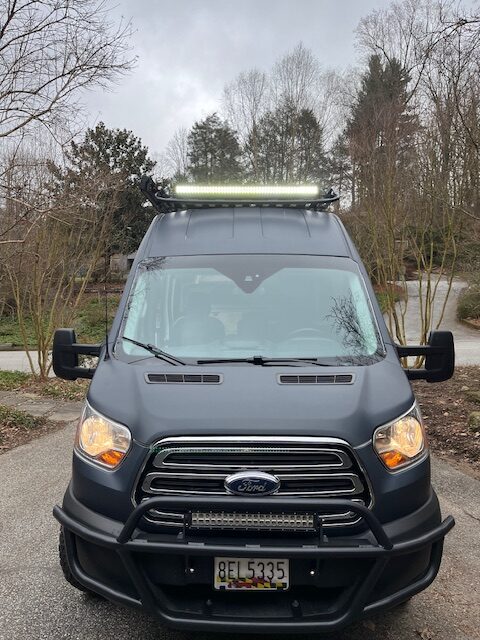 High roof 2019 T350 Ford Transit 148″ wheelbase camper van that has been converted into an adventure beast by VanDo It Vans. It is 4×4 by Quigley and has everything you need to live off the grid or travel the open road. This van comes fully loaded with seating for 5 people, and a queen bed for comfortable sleeping. This van features an Dometic fridge for food and drink storage as well as sink with running water from a 18 gallon fresh water tank, hot water and an outdoor shower for all of your dirty adventures. Solar panels, Lithium battery storage, weboost and mobile modem for reliable internet