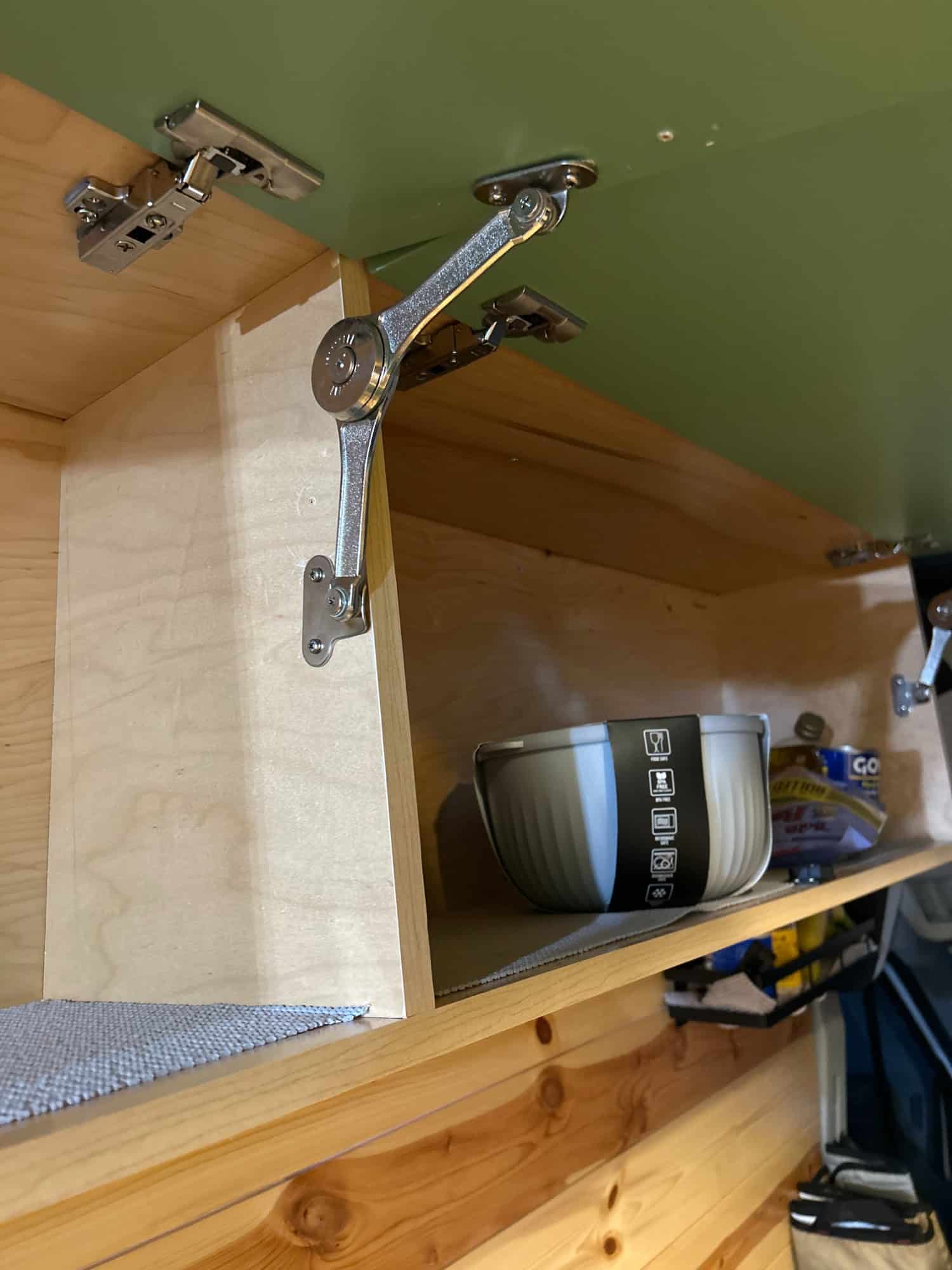 Two overhead cabinets, one for kitchen usage and one for clothing usage