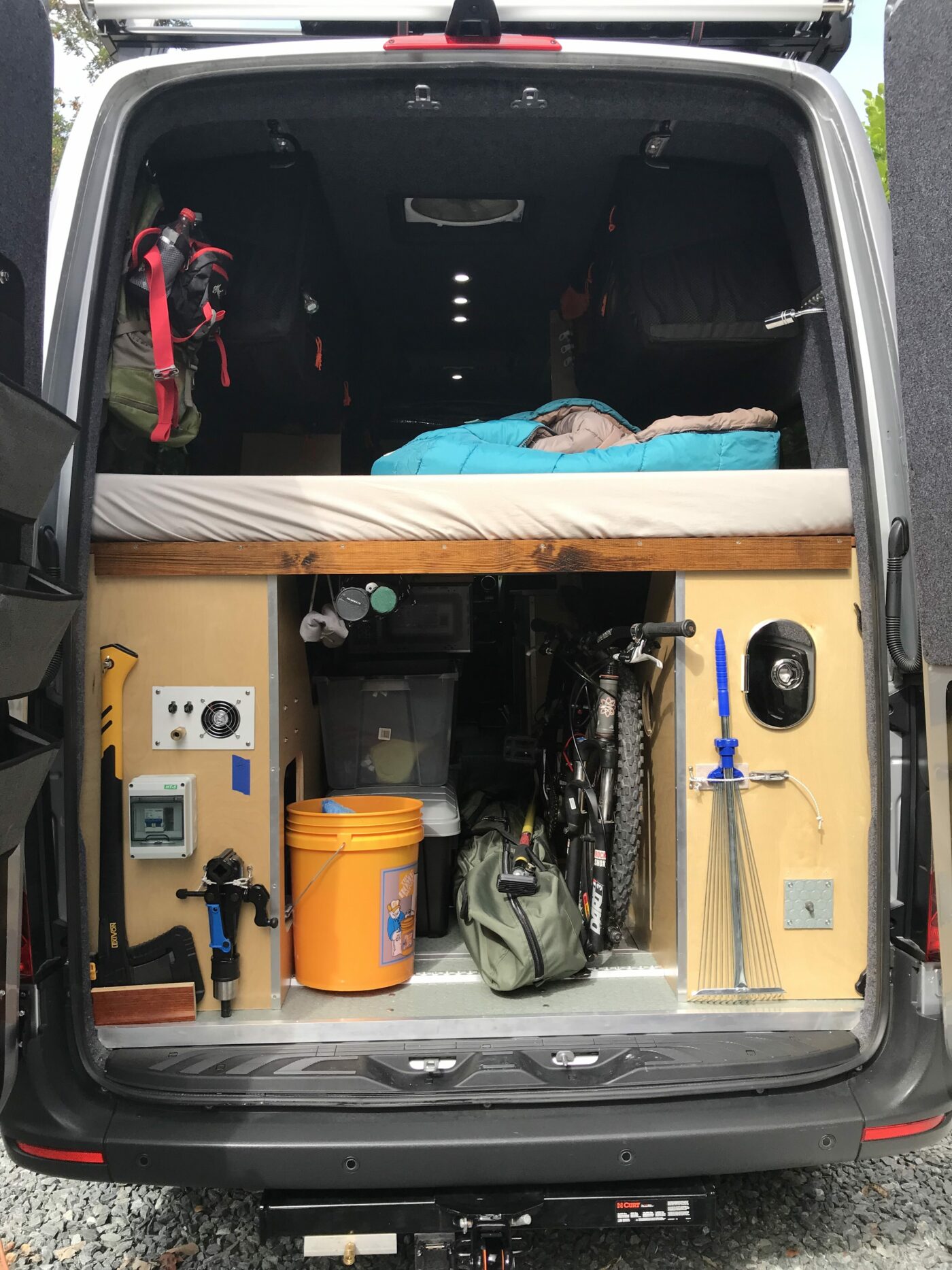 Raised bunk for 2 in back with 6’ x6’ sleeping area. Lots of storage with room for bicycles. Area accessible from inside and rear doors.