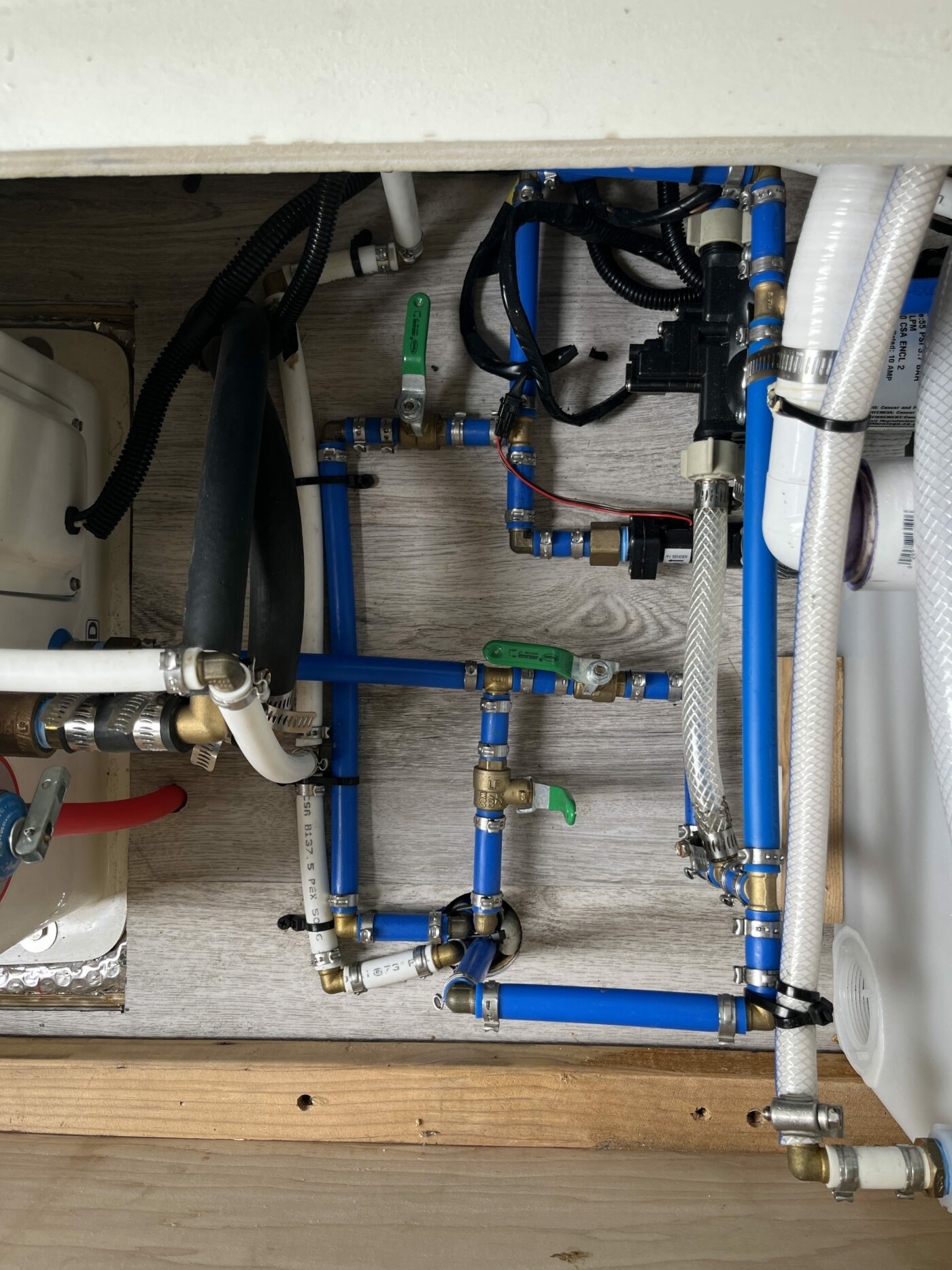 – Kitchen with designer galley faucet, custom soft close cabinets, and butcher block counter- lounge/dining area with custom sofas that convert into a second bed (in case the upper stow-away Happijac bed with organic mattress isn’t enough)