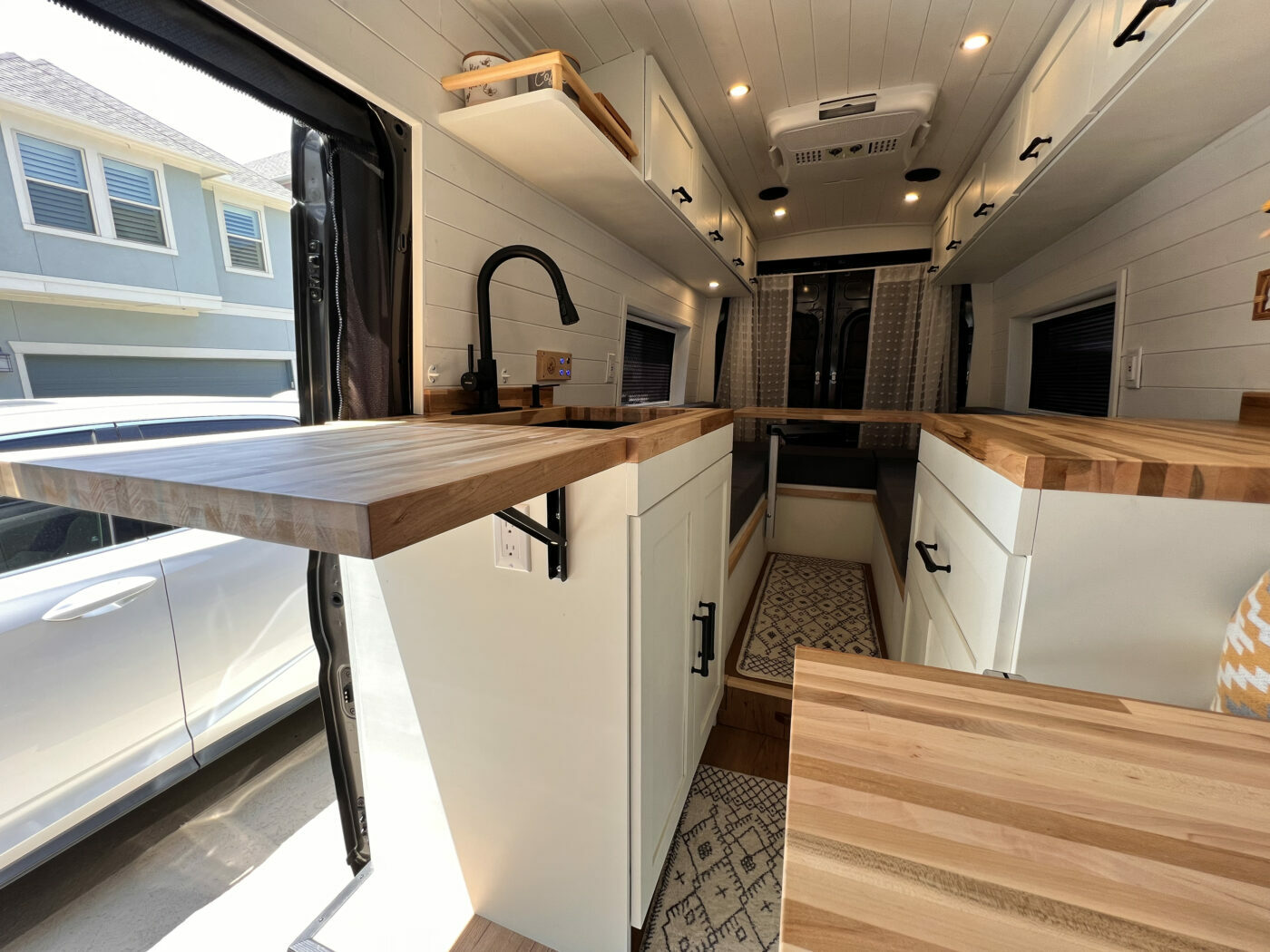 30 gallon freshwater + 30 gallon gray water tanks (installed below the van for more storage space inside)