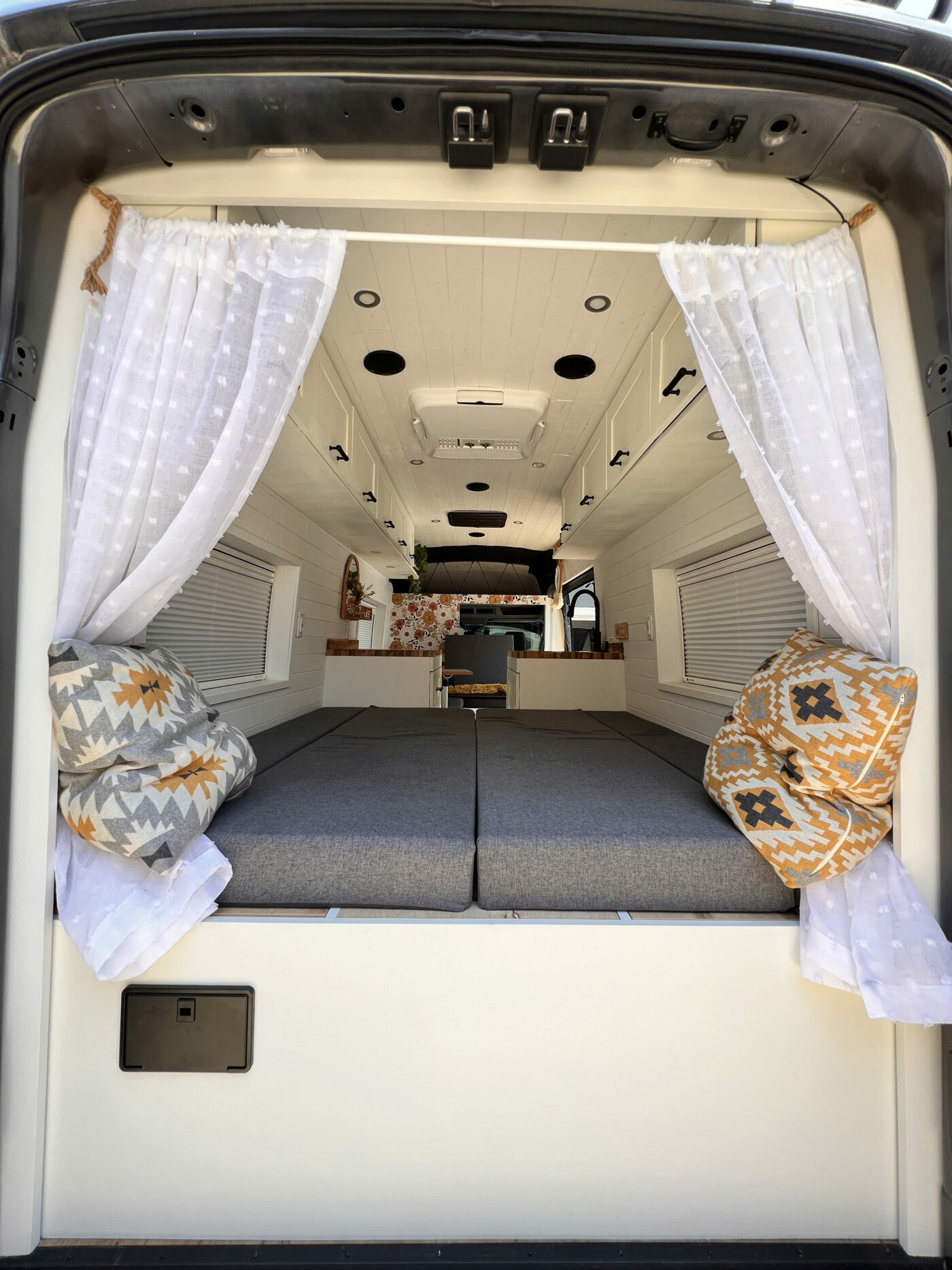 – A MUST in our opinion for privacy and security. All you need to do is slide the pocket doors closed once you setup the van at night or when parking the van anywhere public when you make stops. We didn’t like the idea of a curtain or piece of material so we designed a pocket door system! There’s also a tab to secure the pocket doors open while driving so they don’t slide.