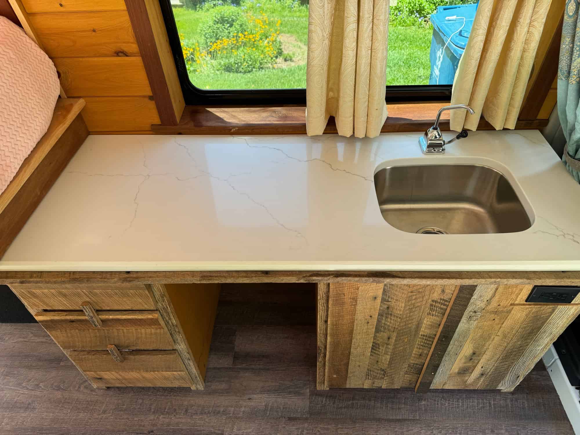 This pristine, high roof van has a 3000w PSW inverter with two deep cycle batteries, shore power and 25’ shore power cord, 5 USB/112v outlets and 2 12v outlets, bright lighting, third passenger seat, maxx air ceiling fan, slider bonded windows with screens on both sides and solid glass bonded windows in each rear door. The cabinetry is reclaimed wood with a white marble counter and a stainless steel sink with a pump and a 7 gallon tank for both freshwater and gray water. The kitchen wall is cedar and the floor is a beautiful wood grained laminate. A full size bed with cutouts provide extra legroom. There are thick curtains throughout for privacy. I travel with a 2 burner coleman stove that I store in the cabinet and a portable toilet. There is no headliner on the ceiling. This low mileage van is in excellent condition; mechanically, and on the inside and out.