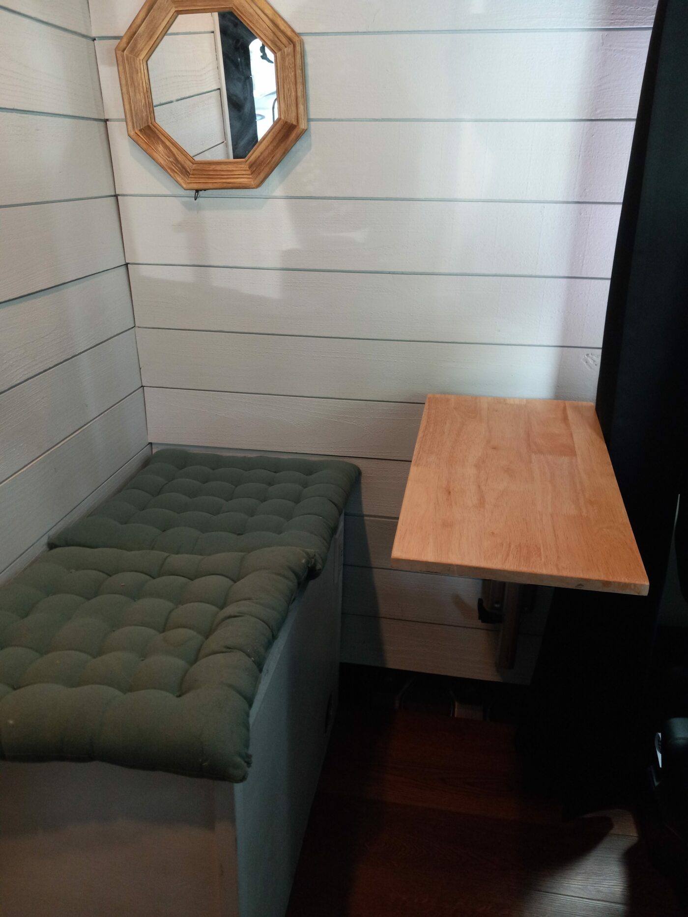 – Construction consists mostly of wood and a little bit of metal. The floor is luxury vinyl planking that is scratch and waterproof. The walls are wooden shiplap and can be painted any color. The ceiling is wooden shiplap that is stained and protected. The entire van is insulated with 3M Thinsulate. The “garage area” is covered with a coin-gripped rubber that is waterproof and easily replaceable.