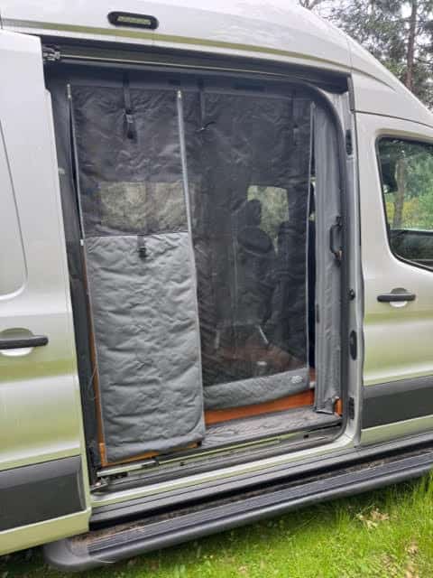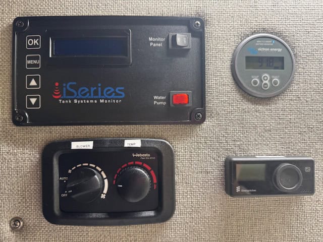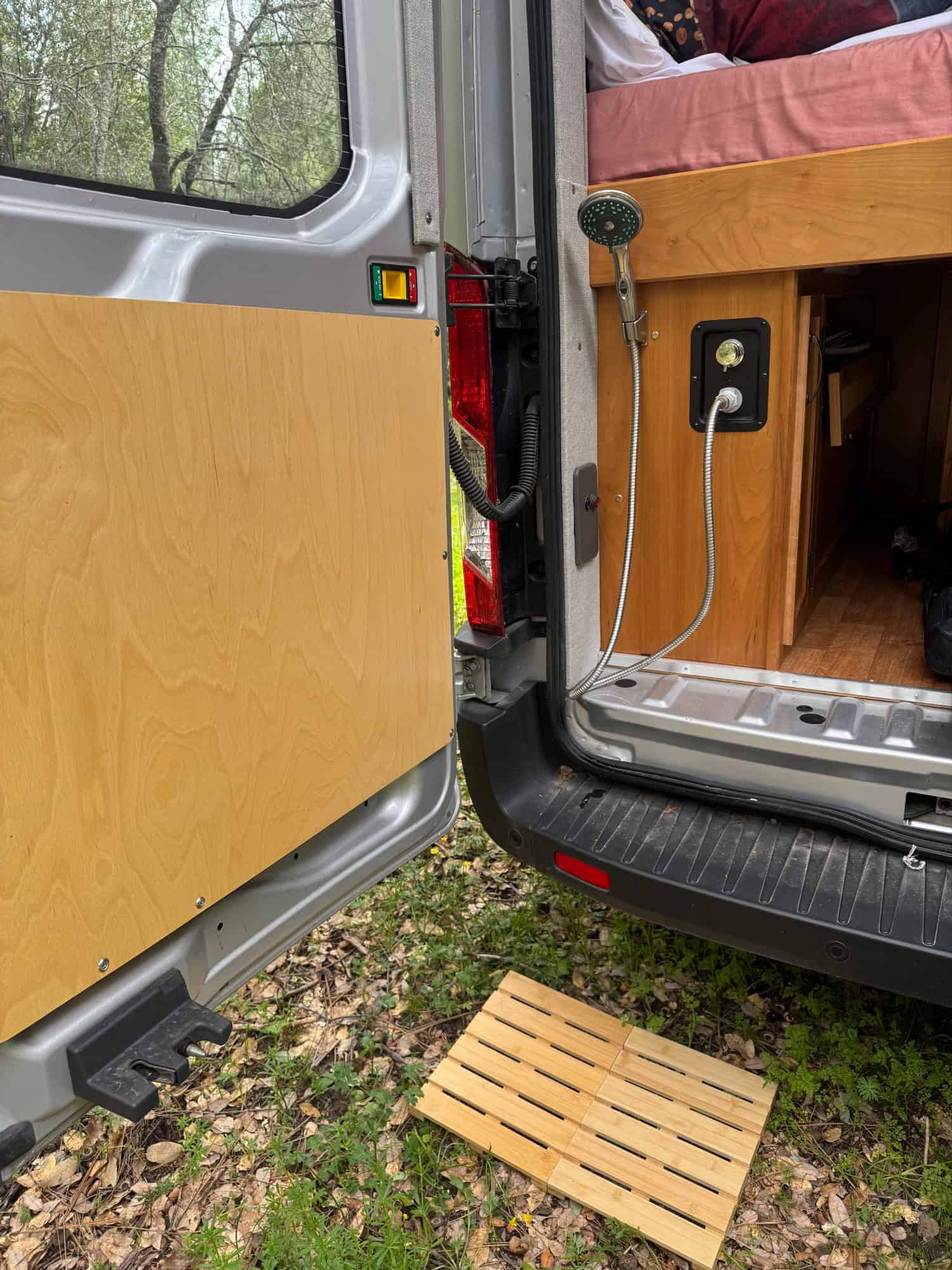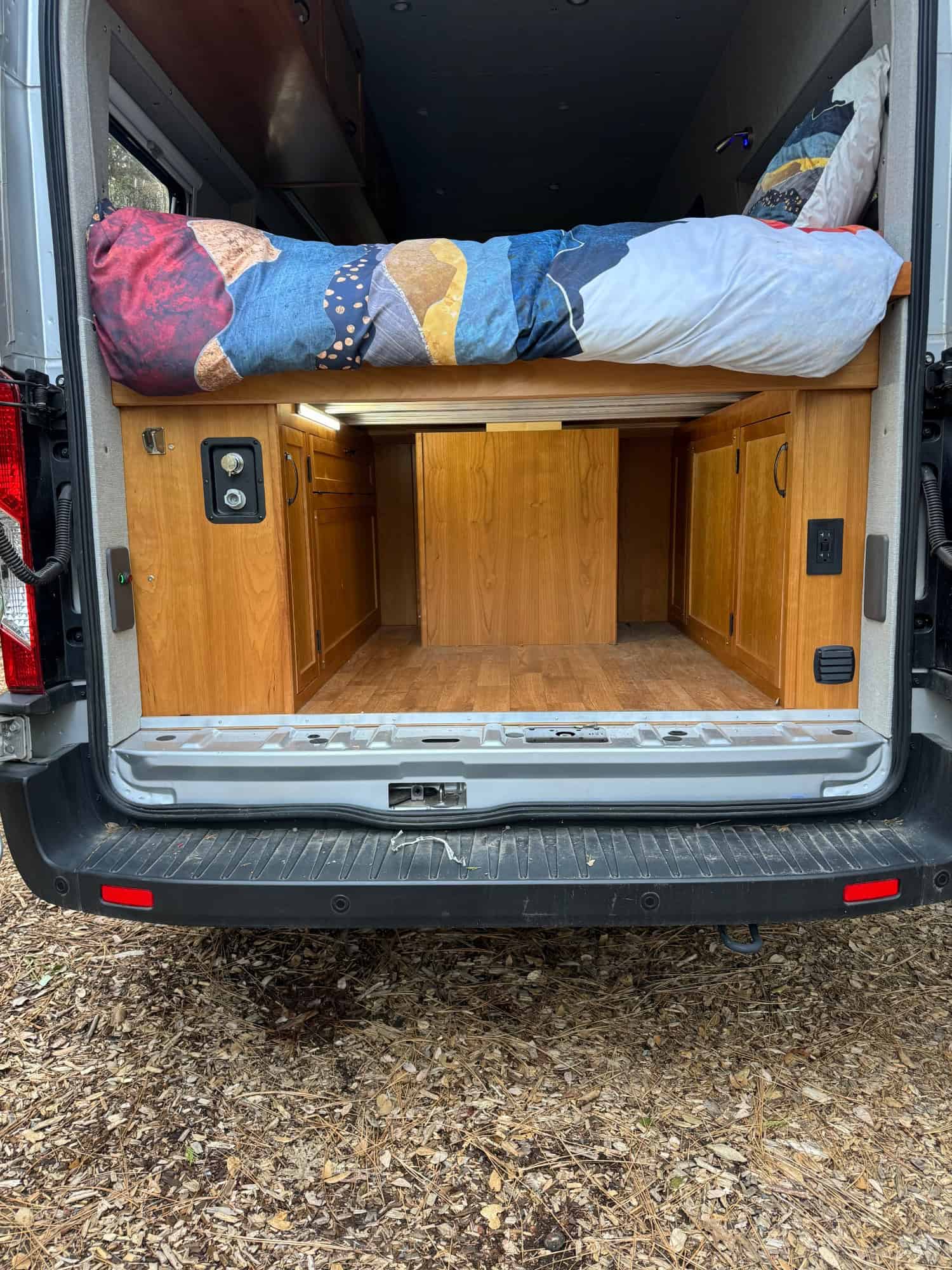 Hot water and interior heater are powered from a boiler heating system that uses gasoline from the van’s tank.(ESPAR/EBERSPACHER GASOLINE HYDRONICS) Lighting is throughout with night lights above the bed and also above the front seats for reading. The overhead has multiple lights all dimmable. We installed an LED night light strip inside to give safe movement in the dark, and an LED light panel and motion sensory light panel above the kitchen area. There is a large refrigerator ideal for storing plenty of food for boon docking and meal preparation needs. A freezer for ice cream and ice cubes. The ceiling van is operated by a remote and runs quietly for warm night ventilation. All windows have portable covers or shades for private. The bed is a queen size and has a pull out stair for an easy step up into the sleeping and relaxing space. The rear doors open to a large garage housing for maximum storage, the drinking water tank (25 gallons), cabinet for the shore power cord and hose for filling the tank, and readily assessable cabinet for the power system. There is an outdoor shower in the rear of the van with hot water and controls to vary the temperature. A cabinet with comfortable bucket toilet, easy to use, convenient disposable bags, a space for portable toilet if desired.