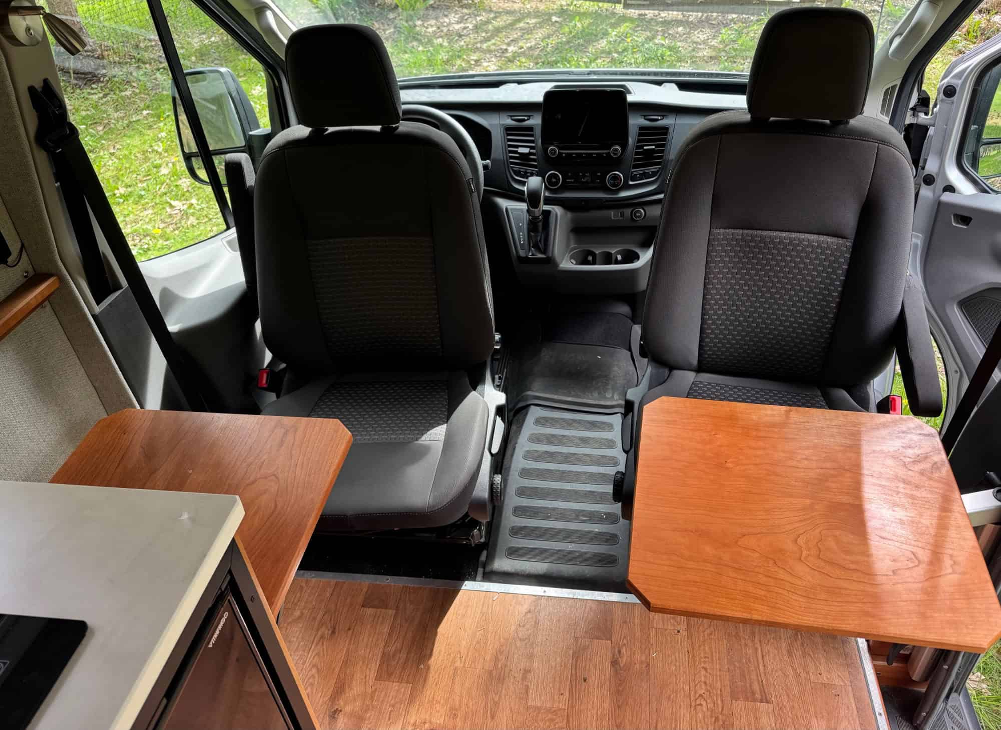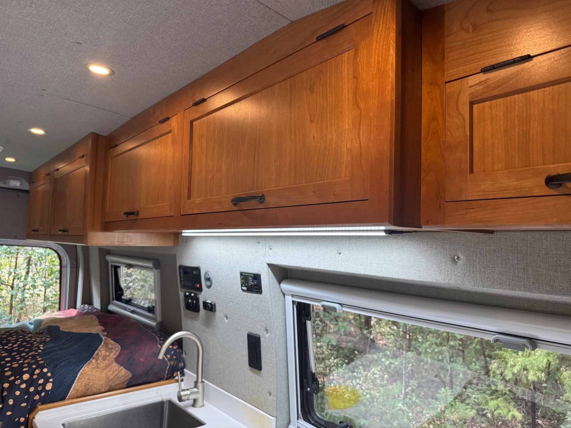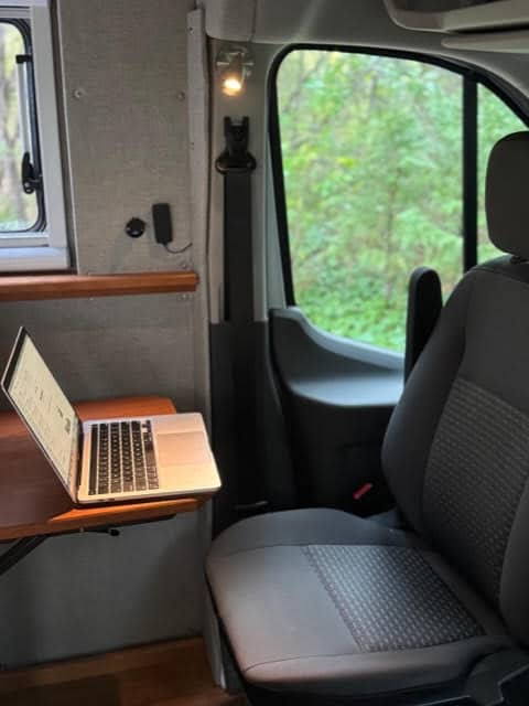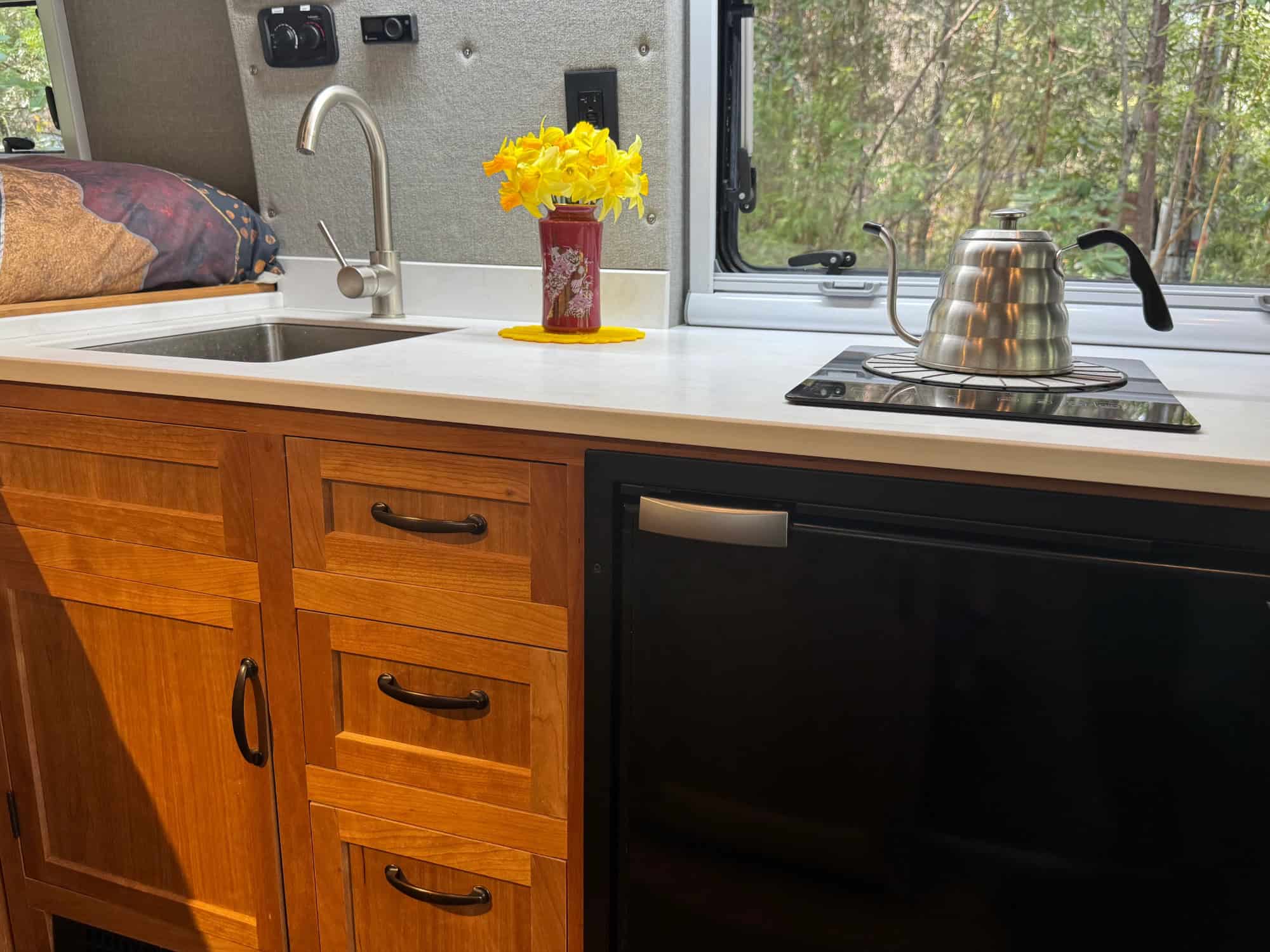 Our build out was done by Chris Hill of Nevada City Vans. The emphasis was on aesthetics, comfort, and advanced technical features. Careful craftsmanship accomplished an attractive interior with cherry wood cabinetry. The van is stand alone independent with no propane appliances. There is a duel 12V and 120 system with a 2,000 watt inverter. The 2 BATTLE BORN LITHIUM BATTERIES 270AH are powered from three sources: solar panels, the alternator, and a shore plug system. We high top allowed us to design the interior to give us room to move around and features two countertops, a deep sink, 25 gallon grey water tank, induction stove, and swivel drivers and passenger seats. There are two table tops stowed and either flip up or on an easy Lagun mount system for meals and office use. Another table top flips down to the outside giving additional useable space and good for eating outside with our folding chairs pulled up alongside.