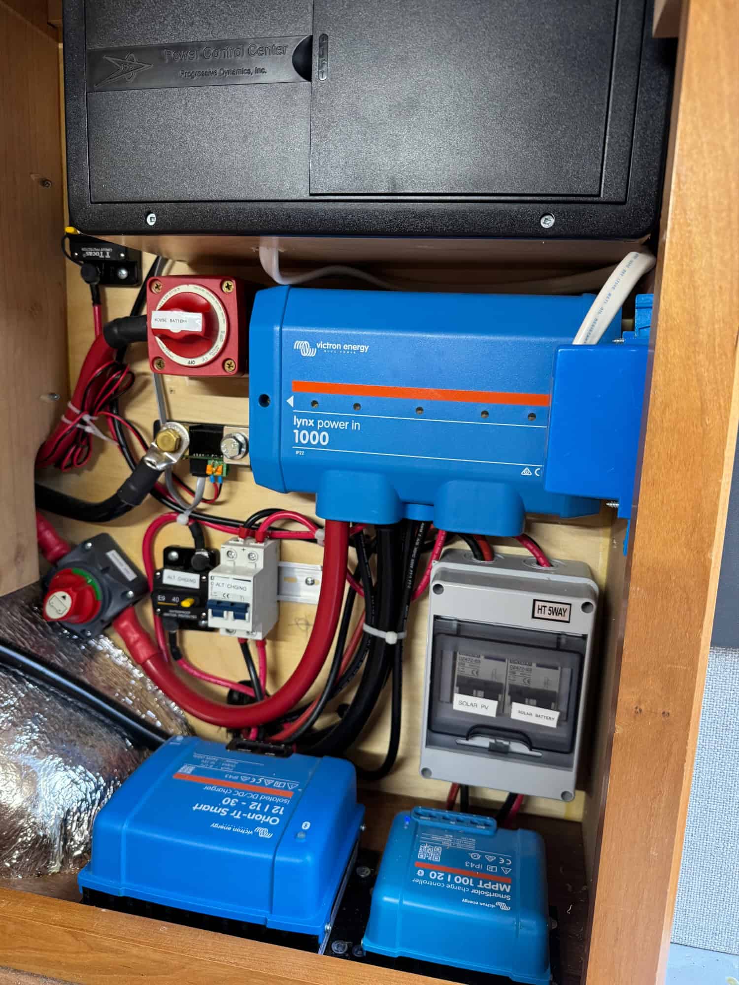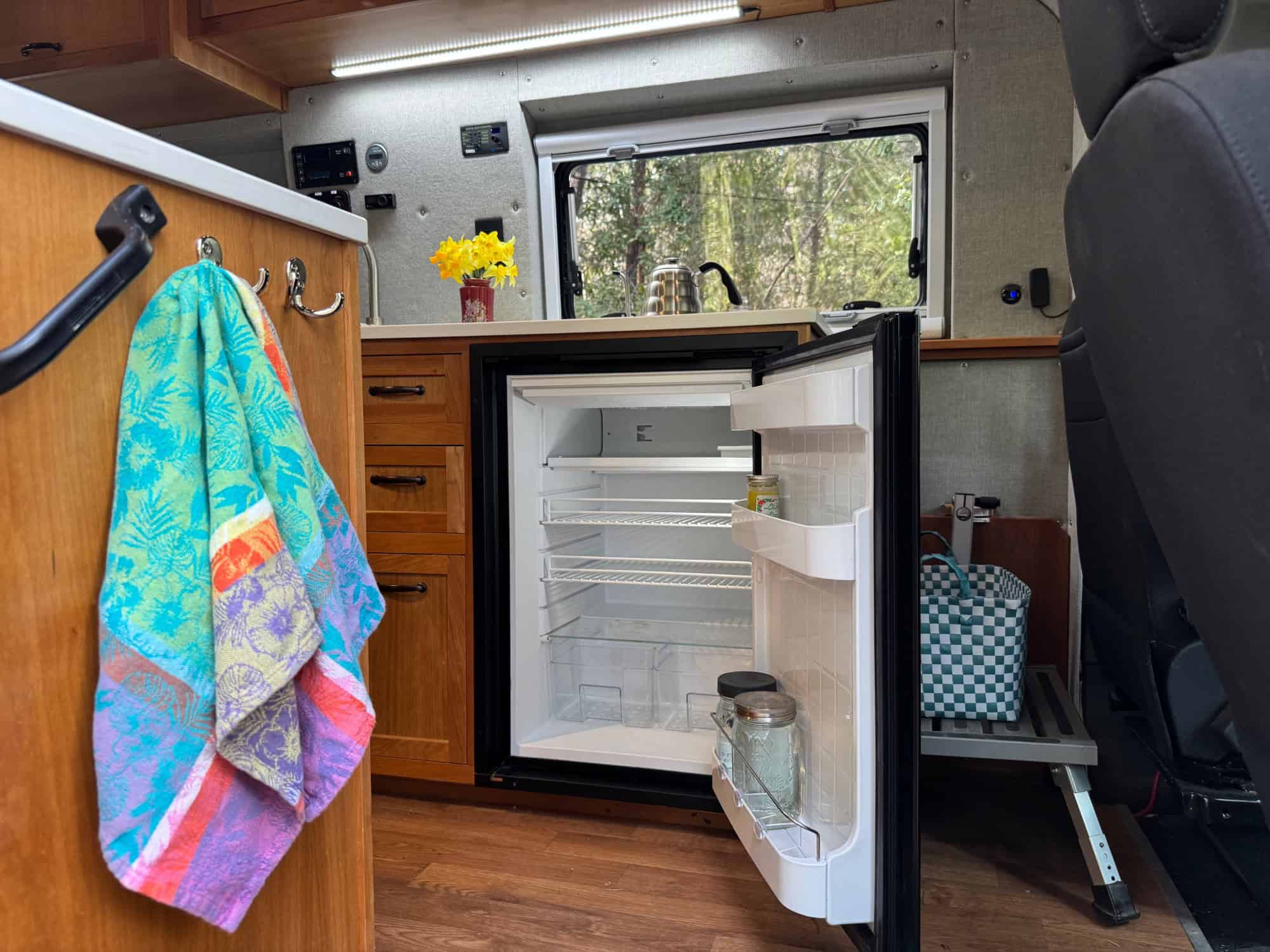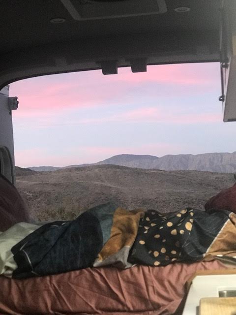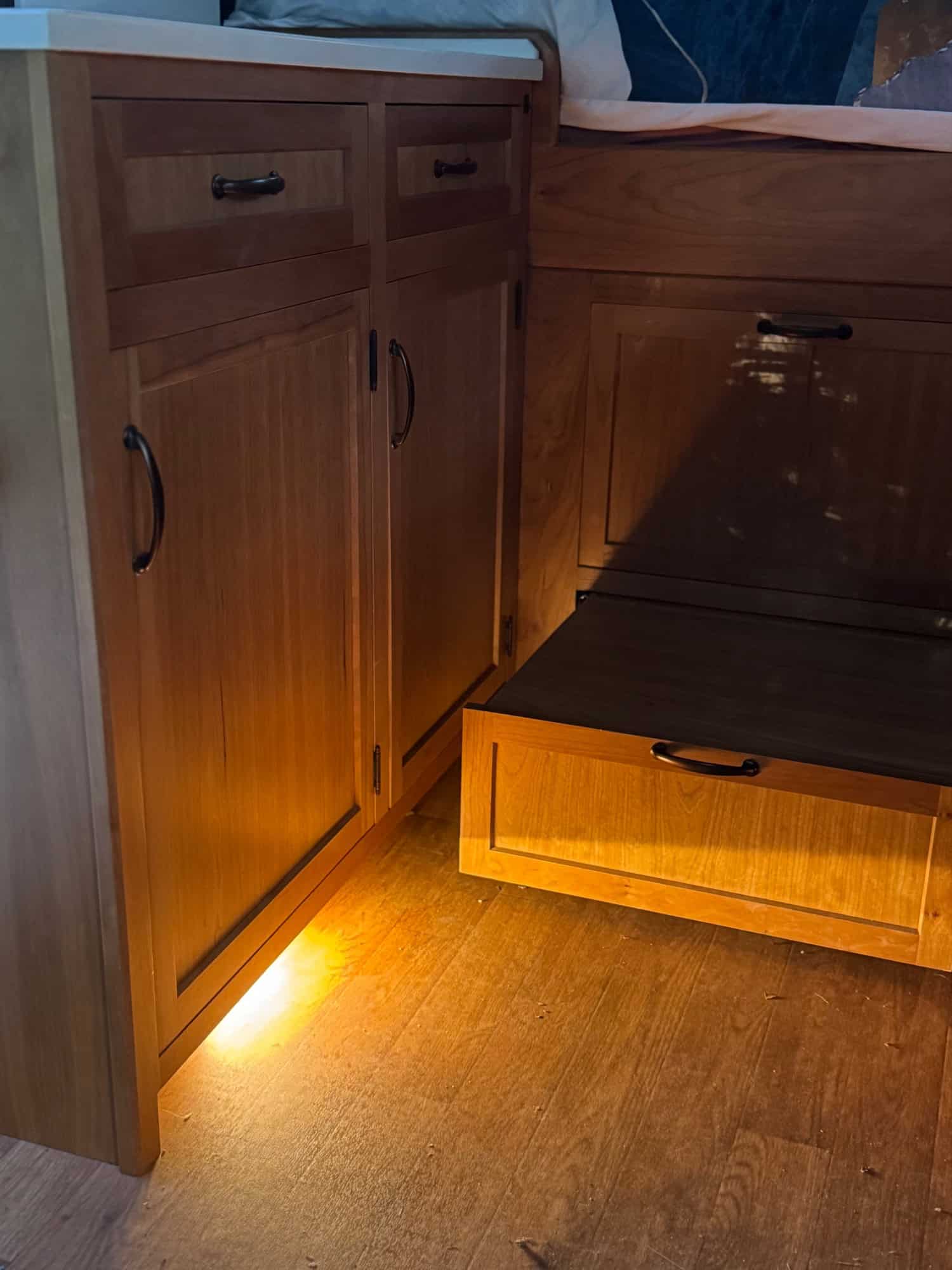 Our build out was done by Chris Hill of Nevada City Vans. The emphasis was on aesthetics, comfort, and advanced technical features. Careful craftsmanship accomplished an attractive interior with cherry wood cabinetry. The van is stand alone independent with no propane appliances. There is a duel 12V and 120 system with a 2,000 watt inverter. The 2 BATTLE BORN LITHIUM BATTERIES 270AH are powered from three sources: solar panels, the alternator, and a shore plug system. We high top allowed us to design the interior to give us room to move around and features two countertops, a deep sink, 25 gallon grey water tank, induction stove, and swivel drivers and passenger seats. There are two table tops stowed and either flip up or on an easy Lagun mount system for meals and office use. Another table top flips down to the outside giving additional useable space and good for eating outside with our folding chairs pulled up alongside.