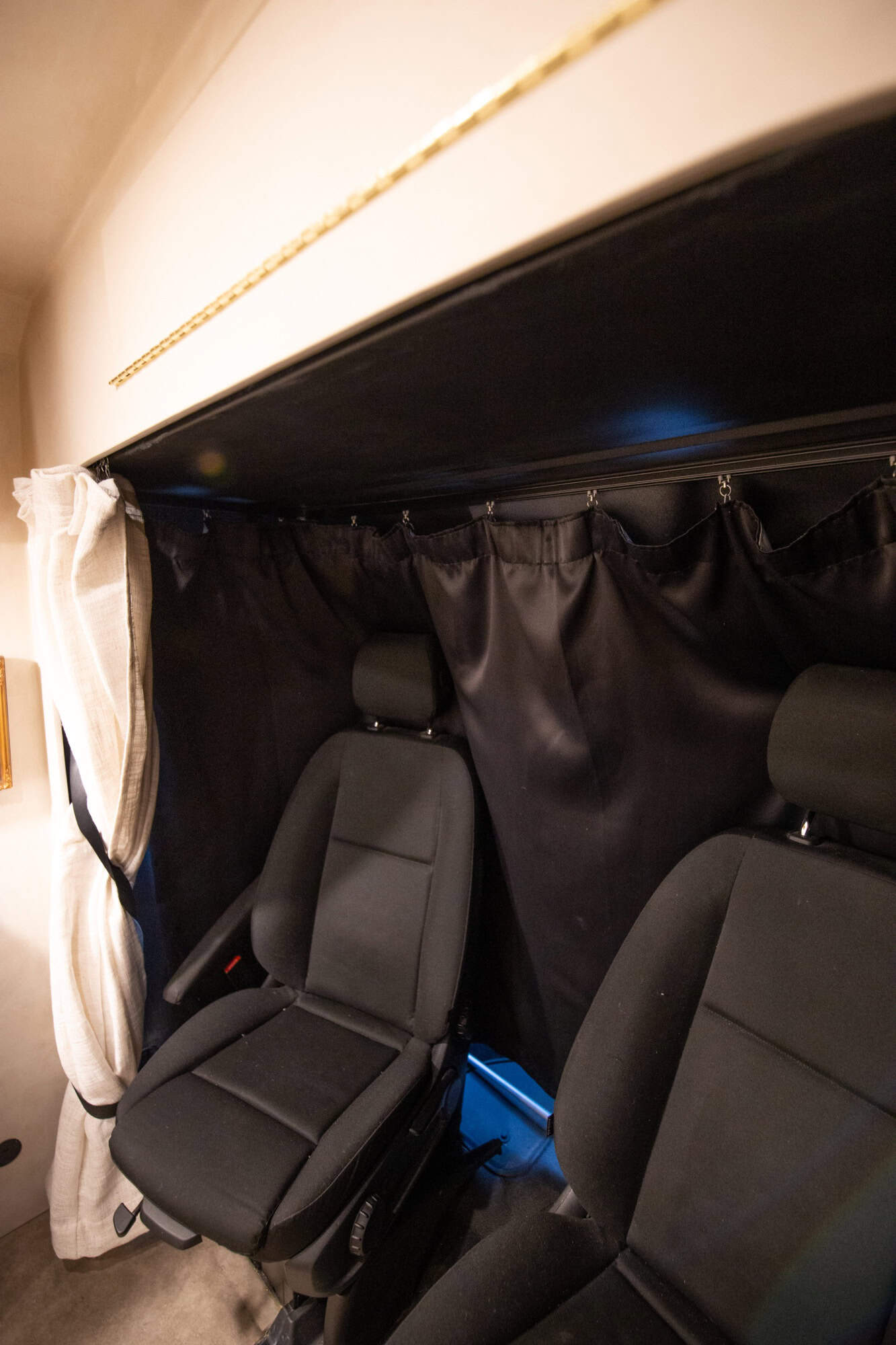 – Aluminum headliner shelf with curtain for a total blackout result while still utilizing the driver and passenger seats.