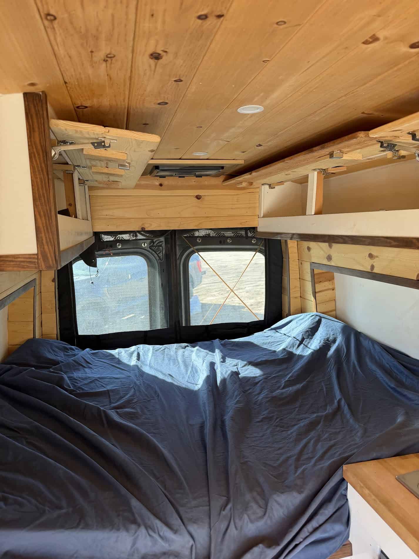 Additionally, because this Transit was specifically built without framing around the bed, it's able to fit a bed horizontally, which frees up a lot of space in the kitchen and 'office' area. The dimensions of the bed are 77" by 70" allowing myself (5'11) and the previous owner (6'4) to sleep comfortably on it without being cramped.