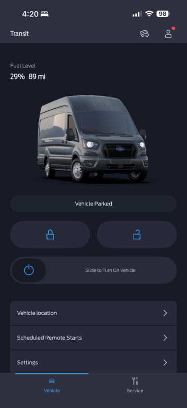 – FordPass app compatible – check location of your parked van, lock and unlock the vehicle, remote or timed starts, all from the app as long as the van in in cell service (or possibly connected via wifi/Starlink, I didn't try this though)