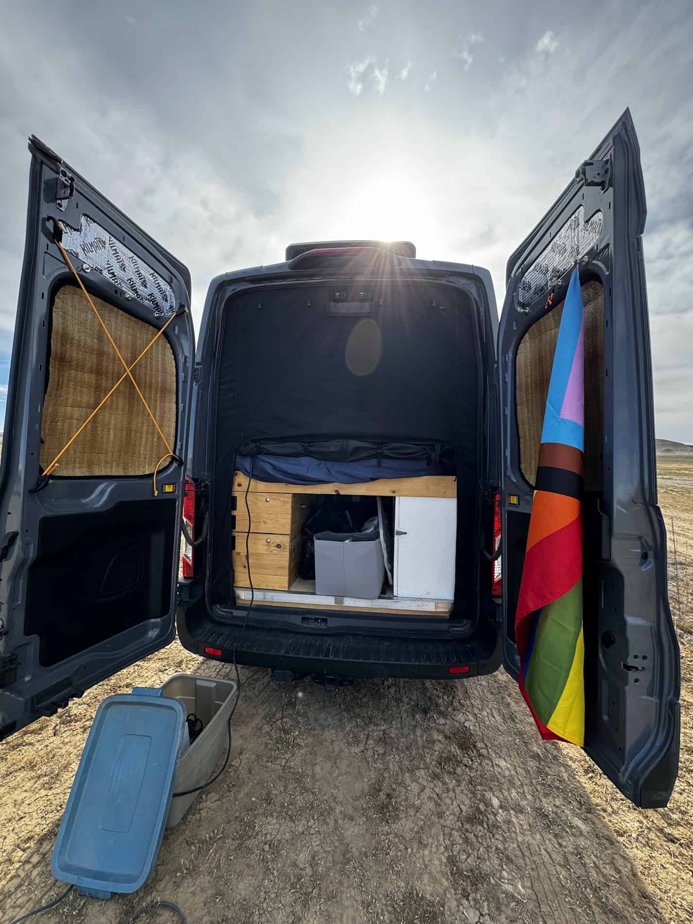 – 10 Gallon gray water tank (unused since I bought it in May 2024, I used the running water only for drinking water but stopped using it because it was easier to fill a separate tank with free Spring water in the Moab area versus $5 to fill the van at the RV supplies shop)
