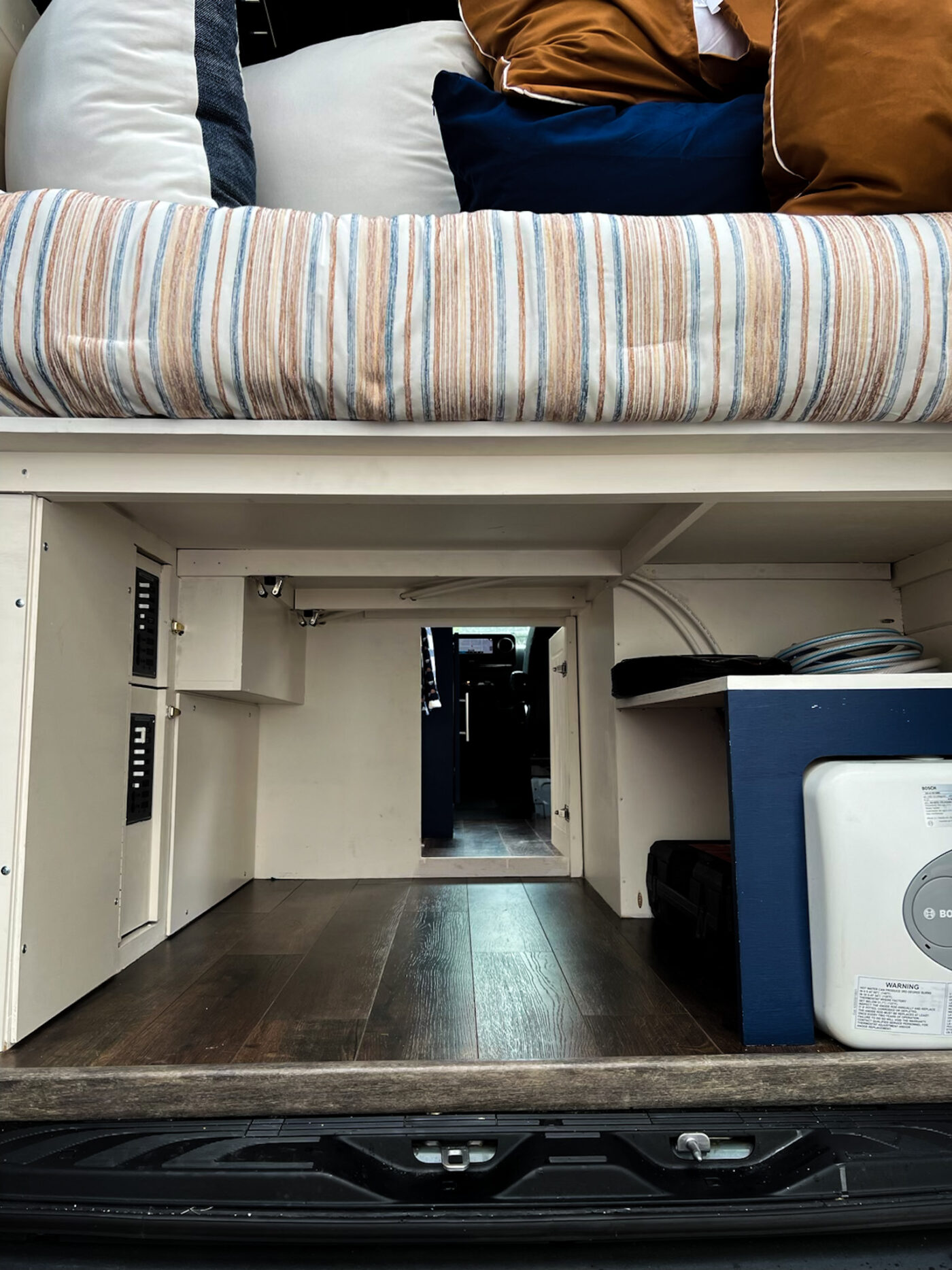 – Large garage area below bed.