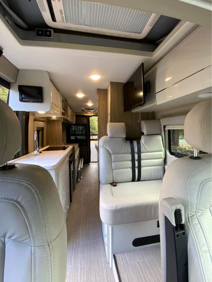 If you are interested in going off-grid, you’ll need a trusty companion like this Tellaro Class B gas motorhome! There are two three-point seat belts at the collapsible dinette table, and when you combine those with the two swivel cab seats, you have the ability to transport four people across town. Right next to the dinette is a 24″ TV with outdoor viewing capability. You can prepare camping meals with ease thanks to the two-burner gas cooktop, and the solid-surface countertops will withstand years of use. There is a pop-up outlet in the kitchen for your convenience, and you can create more sleeping space by adding the optional retractable roof top with SkyBunk® sleeping area.