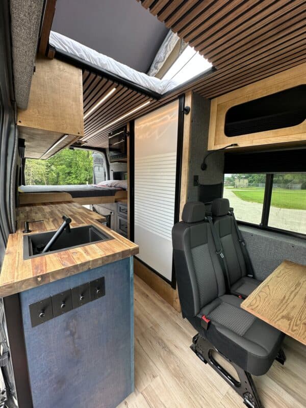 A private full bathroom with a shower offers privacy. Hot water is continuously heated while driving, with battery backup for extended off-grid stays. And for those warm nights, the DC-powered air conditioner provides a cool and comfortable sleeping environment.