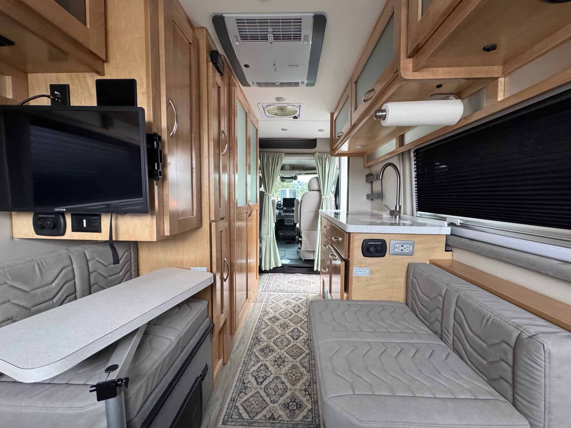 With 19,000 miles / well-maintained features a spacious rear lay-flat power sofa, a fully equipped galley with a induction cooktop, Sink, Microwave, solid surface countertops, and a large 7.3 cu. ft. refrigerator with separate bottom freezer drawer and custom solid maple hardwood cabinetry! Plus a roomy wet bath with a porcelain toilet. The pull-down rear door screen offers awesome ventilation.