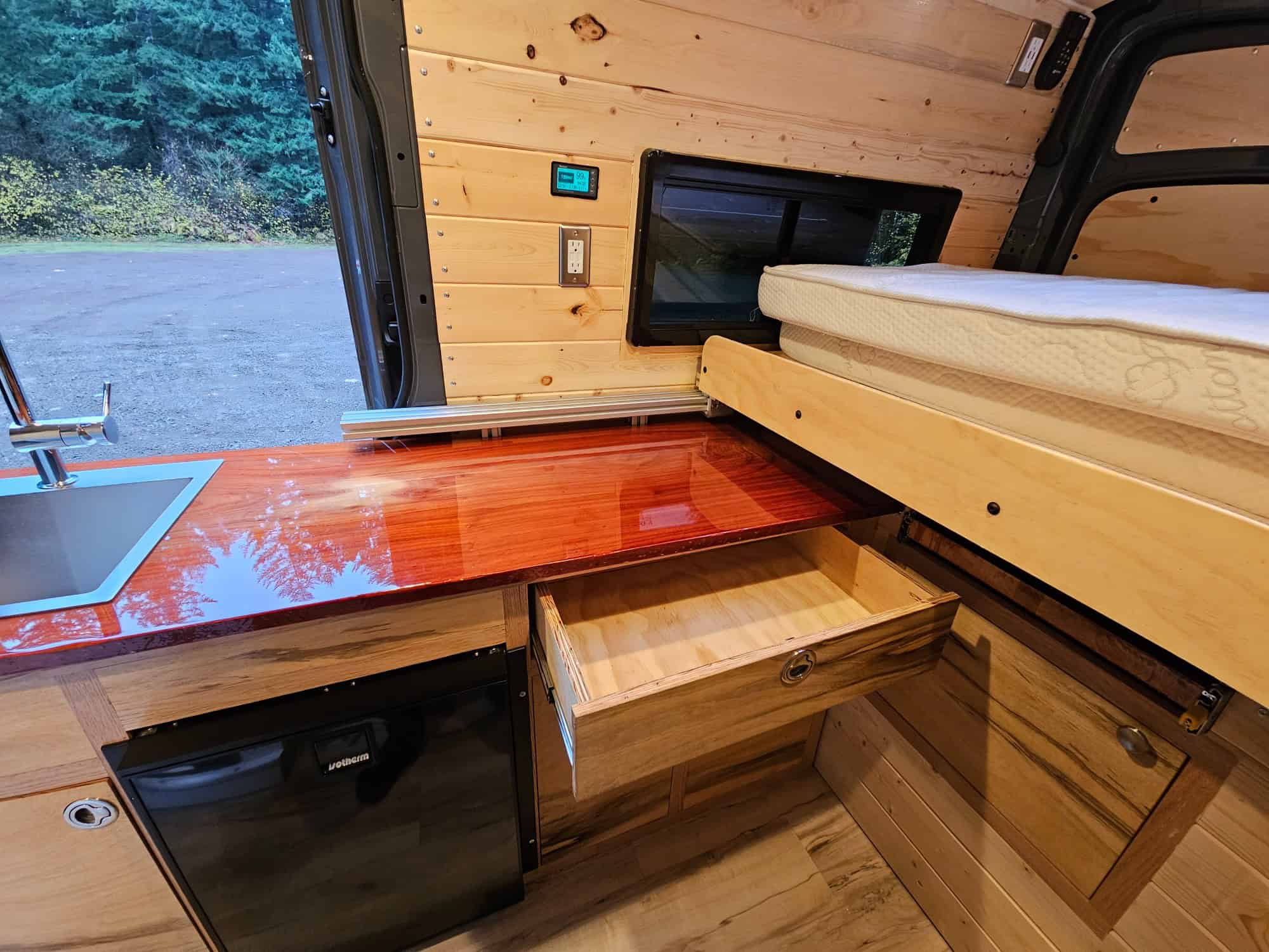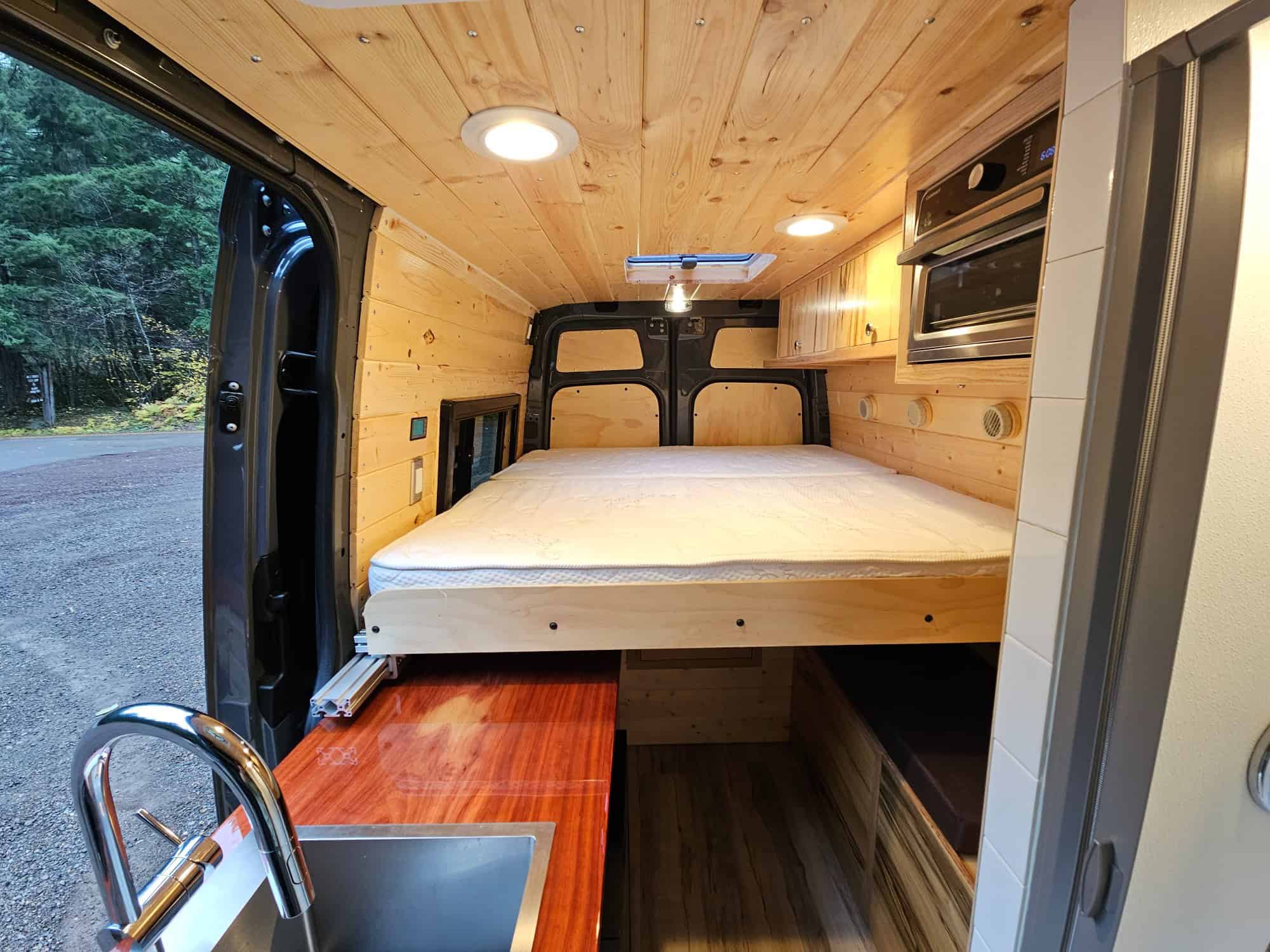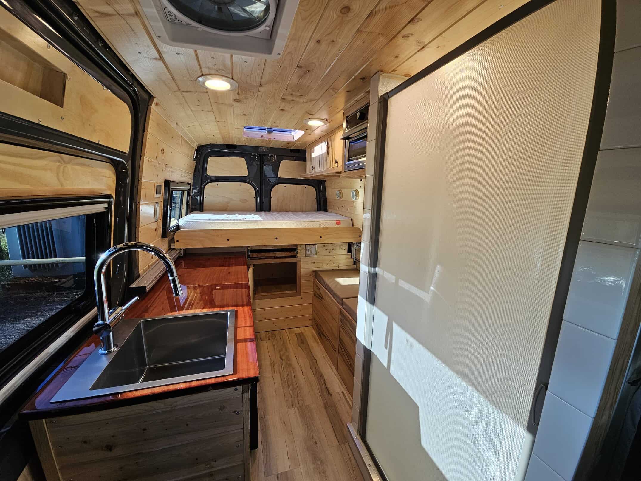 The van itself is a new 2024 144″ High Roof Mercedes Sprinter. 4-cyl Turbo-Diesel RWD Drive with 2500 miles . The vehicle comes with a 7 year/ 100,000 Mile factory extended warranty. The asking cost of this conversion is 149,995